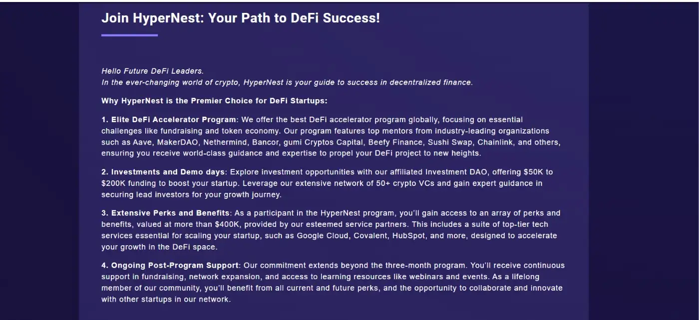 - Apply for the Accelerator: If you have a blockchain startup that aligns with the goals of HyperNest, you can apply for the 12-week accelerator program through the website. Successful applicants will receive tailored support and access to the extensive HyperNest network.
