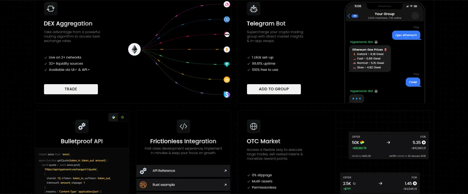 With support for both developers and traders, Hypersonic is building an ecosystem of tools. The bulletproof API supports seamless integration into bots, apps, and trading dashboards with libraries available in NodeJS, Python, and Rust. Its Telegram bot also brings trading into social environments, providing gas insights and one-click swaps to thousands of communities worldwide.