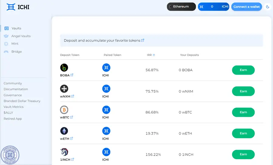 - Deposit to Vaults: Access the ICHI App. Here, you can deposit your tokens into Yield IQ Vaults to start earning yields.