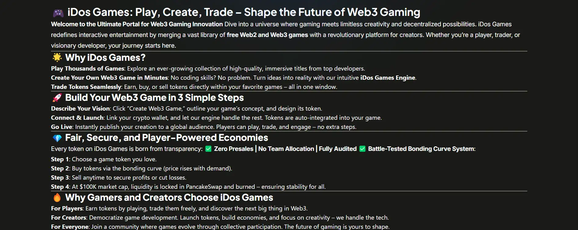 Once a game’s token on iDos Games reaches a $100,000 market cap, the liquidity is automatically locked and the LP tokens are burned on PancakeSwap. This process is irreversible and ensures that the token’s economy is community-governed and transparent, without the risk of developer intervention or manipulation.