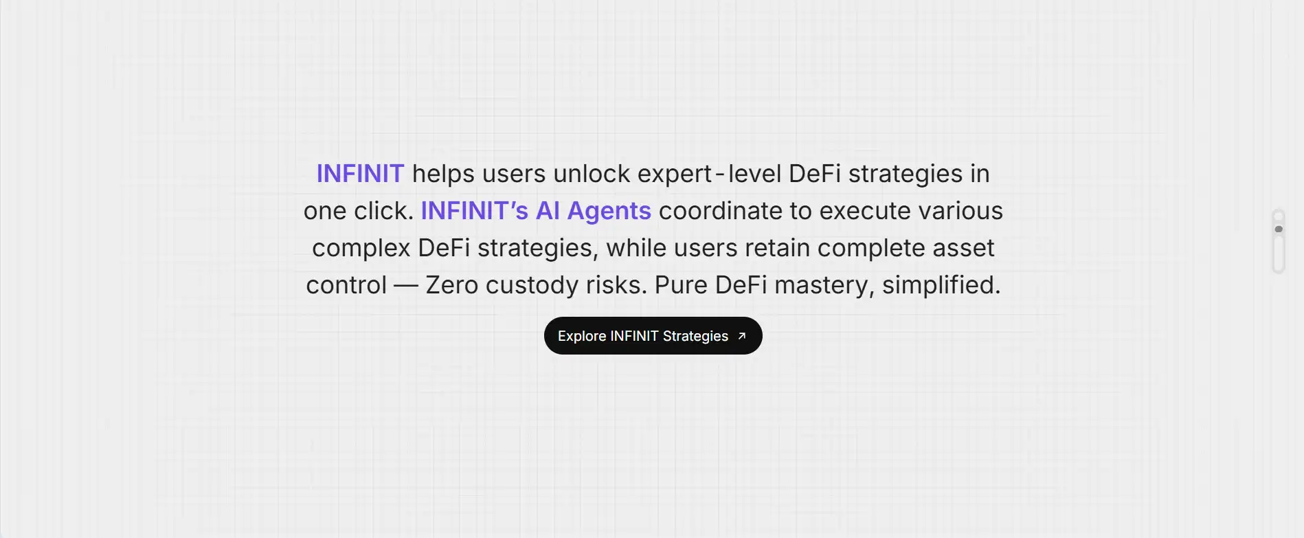 - One-Click Strategy Execution: INFINIT allows users to perform complex, multi-step DeFi strategies across chains and protocols in a single click, using AI agents that coordinate and simulate execution securely.
