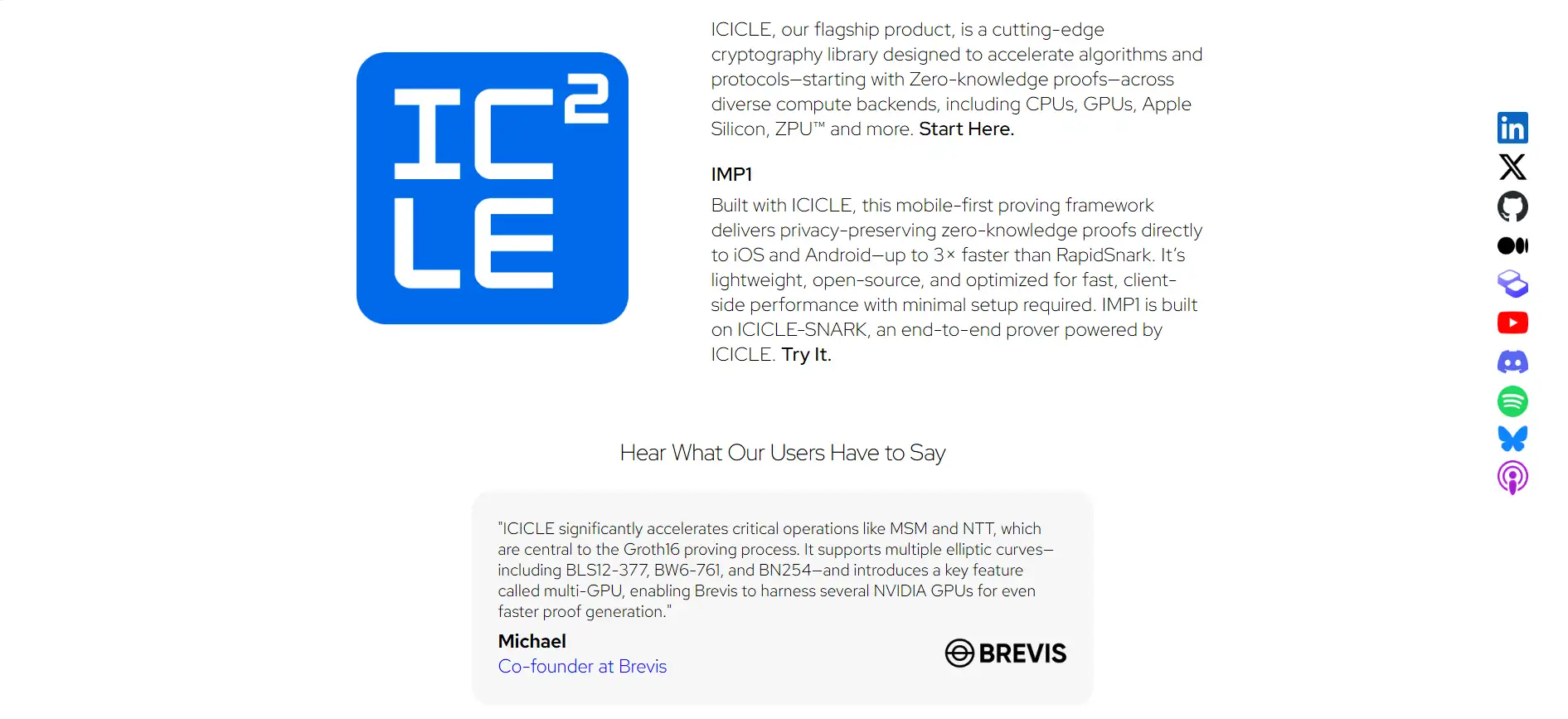 The versatility of ICICLE has made it a go-to choice for many prominent Web3 projects. Brevis leverages its multi-GPU support for large-scale zk computation. Zerobase has adopted it for real-time ZK processing at global scale. ConsenSys integrated ICICLE into Gnark to realize an order-of-magnitude speed improvement in ECDSA P-256 verification. Lightscale achieved a 4x performance gain in Circom proof generation after integrating ICICLE into their Tachyon framework.