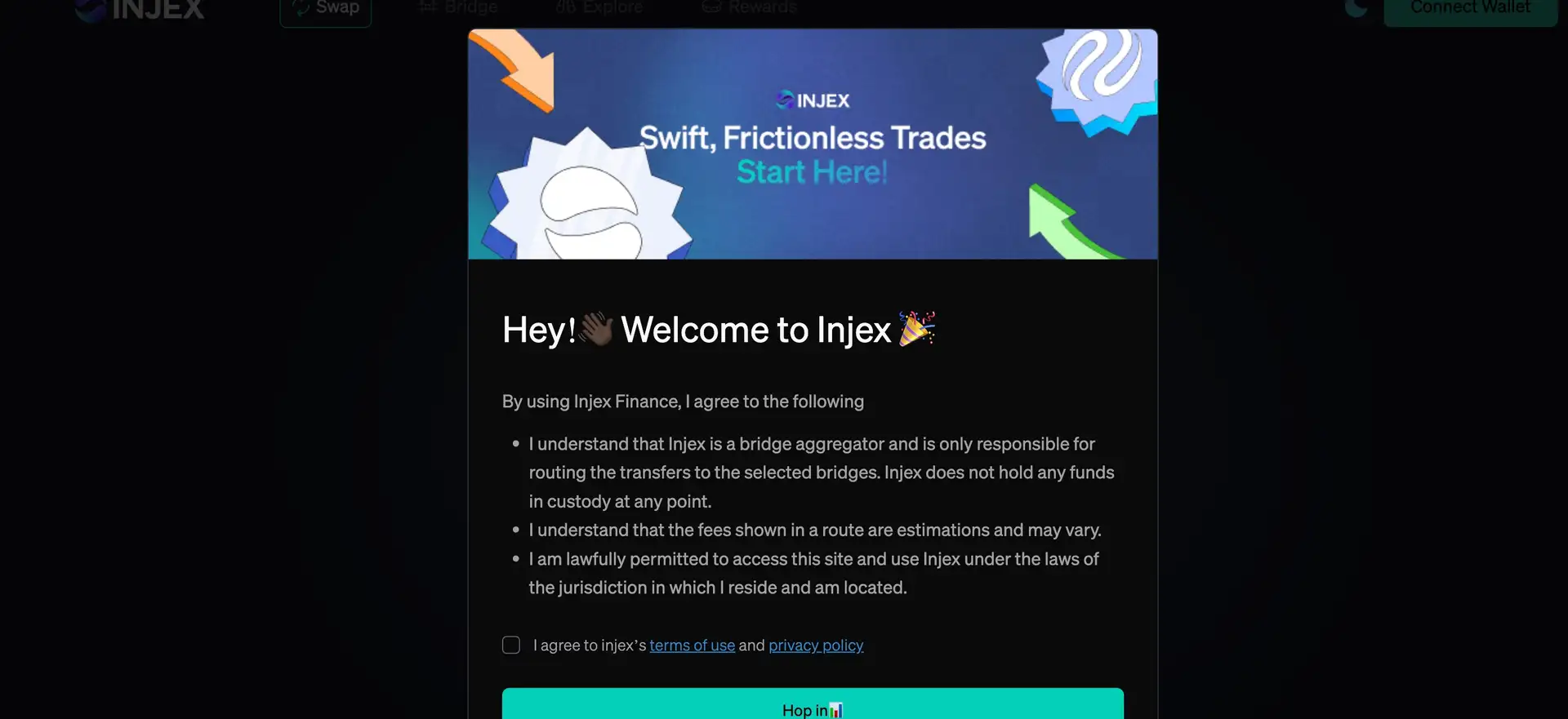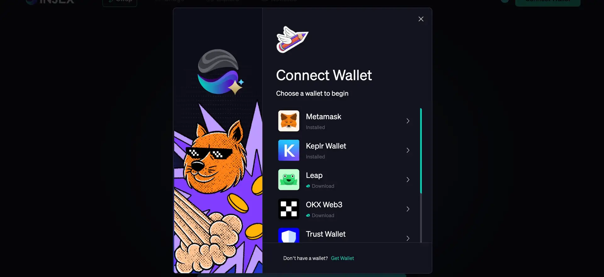 - Visit the Injex Finance website and connect a compatible wallet like MetaMask or WalletConnect.