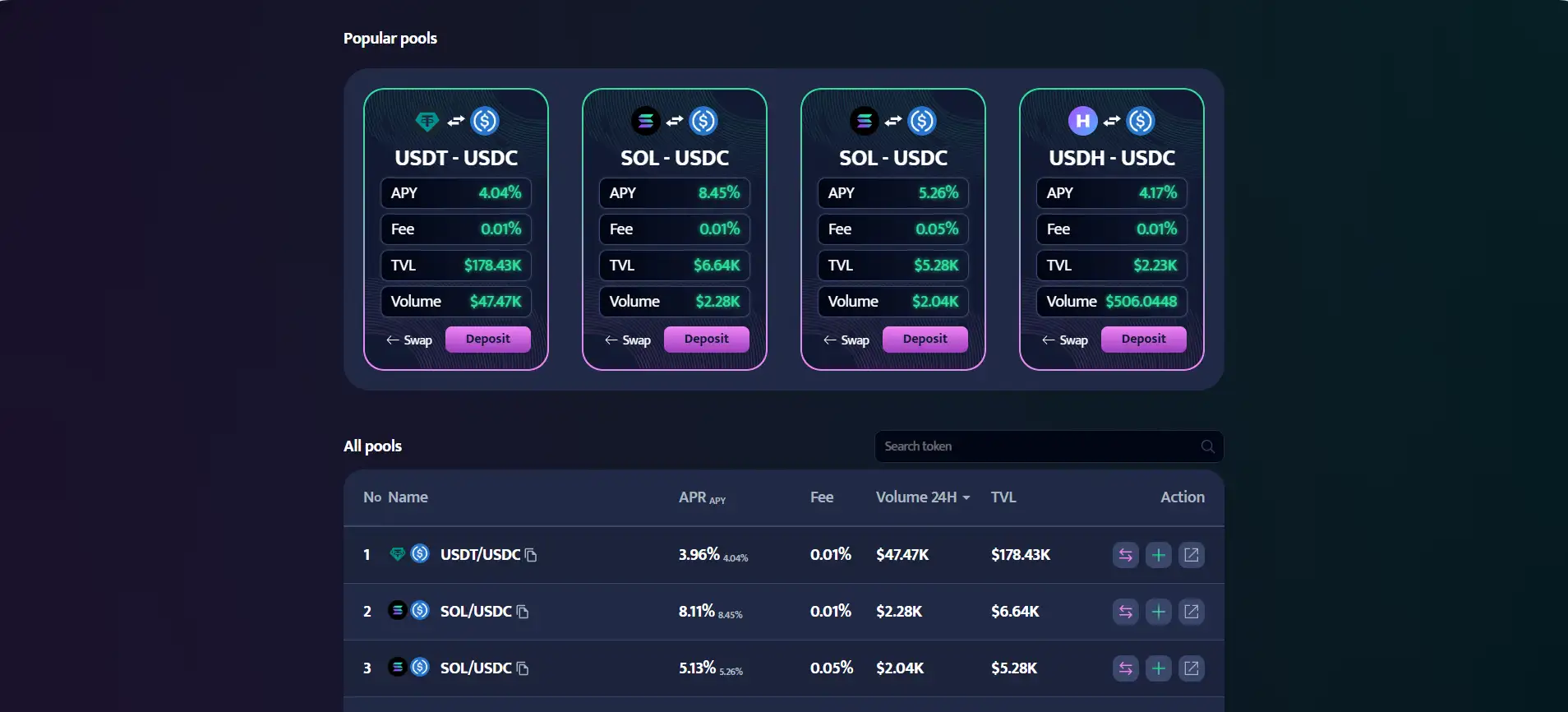 A key innovation of Invariant is its ability to create customizable liquidity positions with flexible fee tiers—ranging from as low as 0.01% to an exotic 10% tier. These tools are especially effective in volatile or experimental markets, like meme coin trading. With its fully-permissionless architecture, users can create, customize, and manage their positions without any centralized gatekeeping. The system is further enhanced by a tick-based architecture, allowing positions to be created with precise granularity and improving pricing on stable pairs.