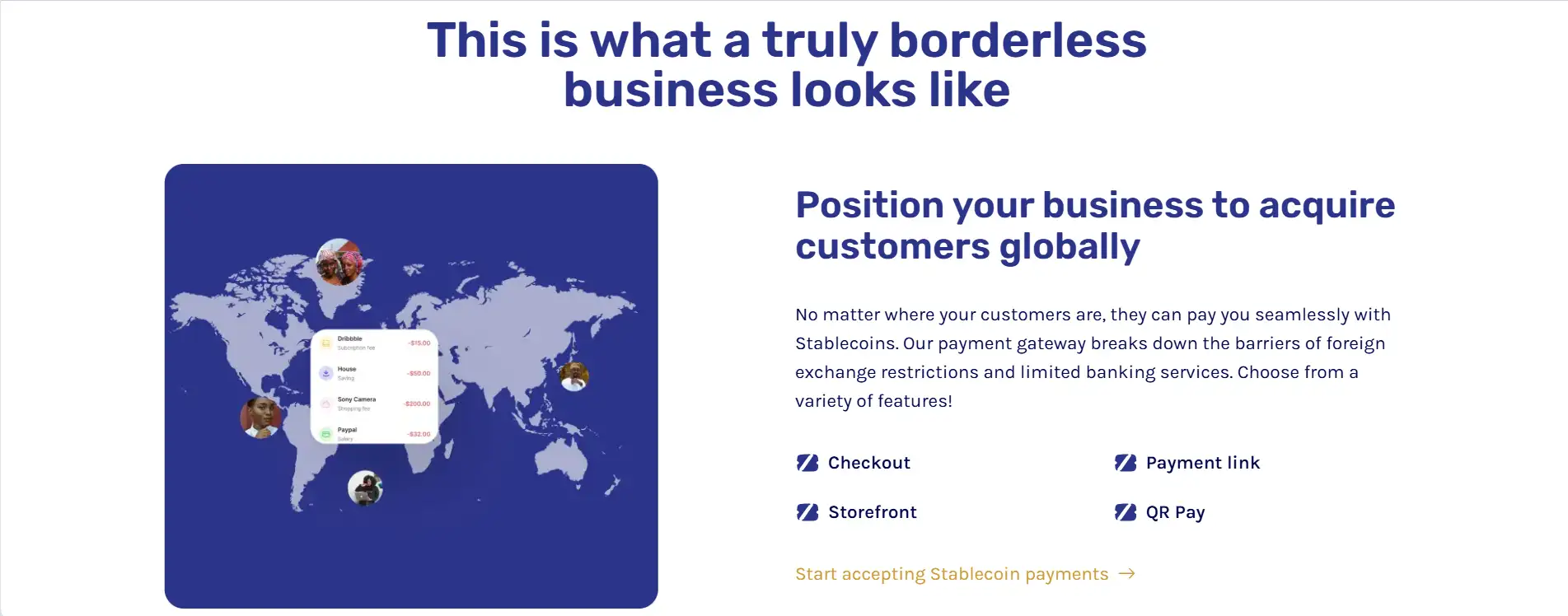 - Borderless Stablecoin Payments: Businesses can accept USDT, USDC, and BUSD payments from customers around the world, enabling global transactions without relying on traditional banks.