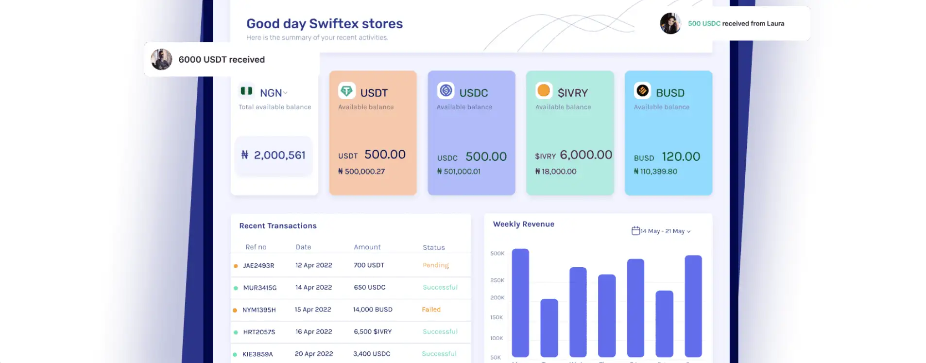 - Start Accepting Payments: Begin receiving payments in USDT, USDC, or BUSD. Ivorypay will automatically convert funds to fiat and send them to your preferred account.