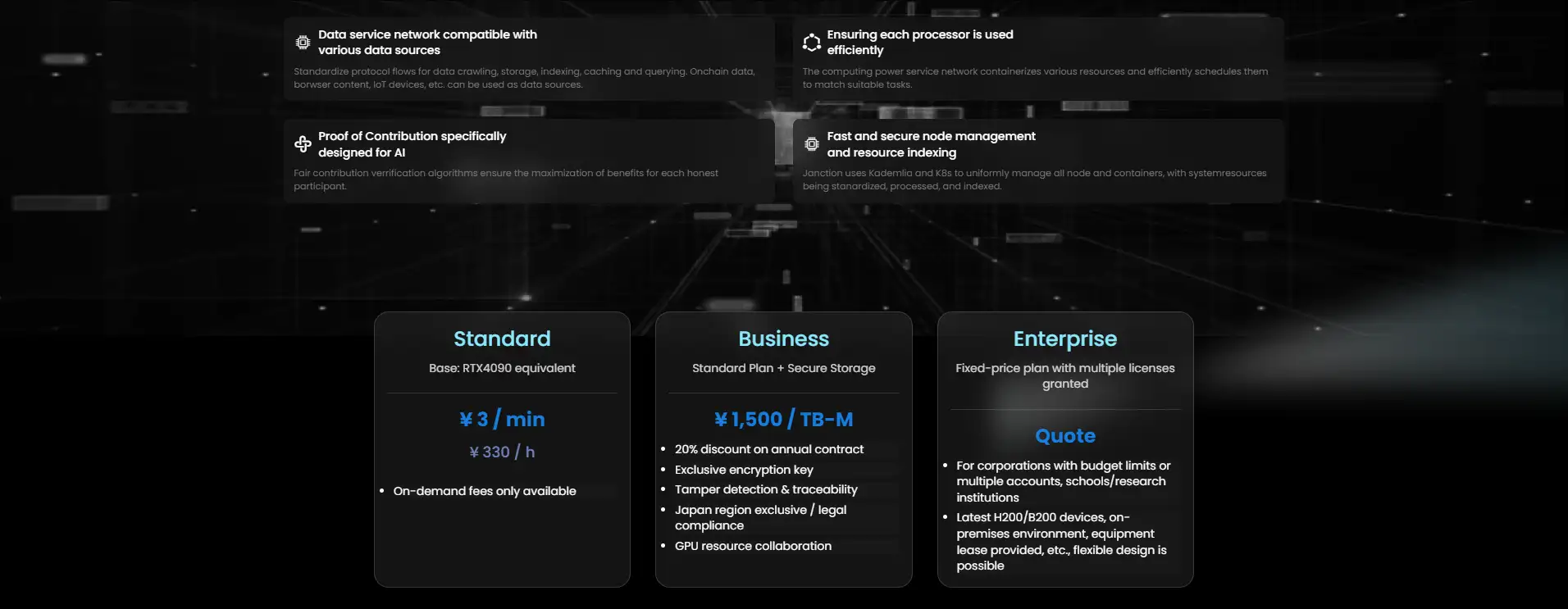 One of Janction’s defining innovations is its Proof of Contribution protocol—an incentive model that verifies and rewards honest participation by measuring actual computational workload. This ensures fair distribution of earnings for GPU providers and supports decentralized AI model training without the need for a centralized authority. The platform also integrates robust privacy and compliance features, including encryption keys, tamper detection, and localized processing to meet legal standards in regions like Japan.