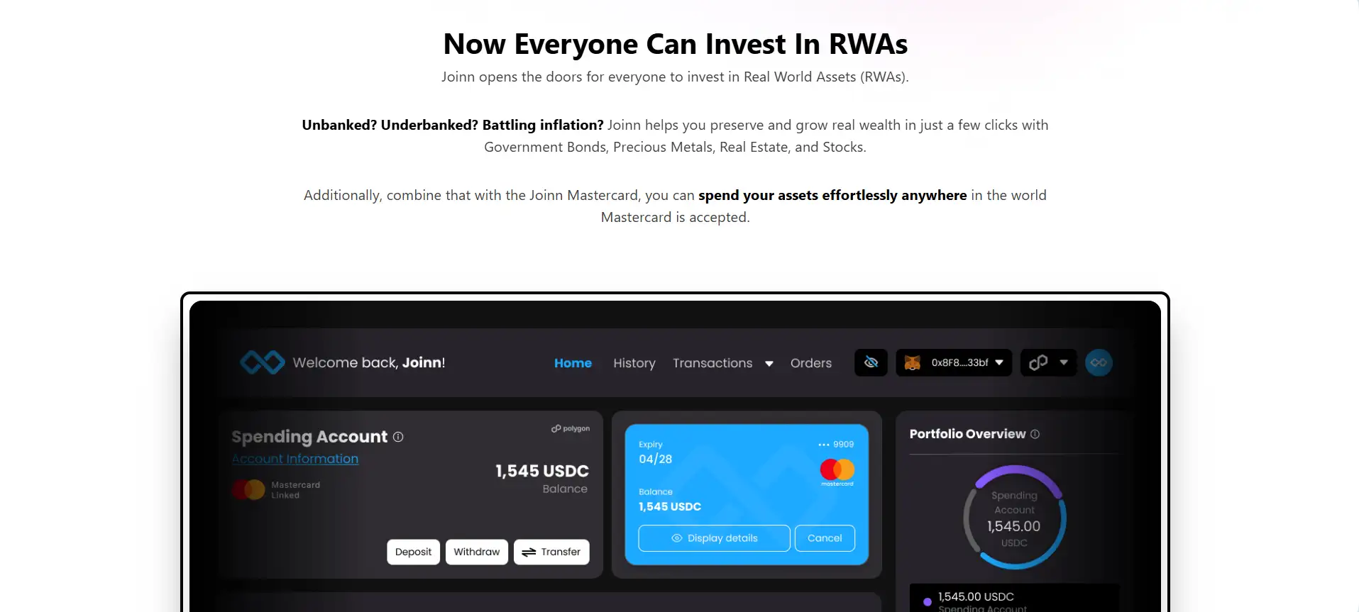 - Invest and Spend: Allocate your capital, then use the Joinn Mastercard to spend assets globally.