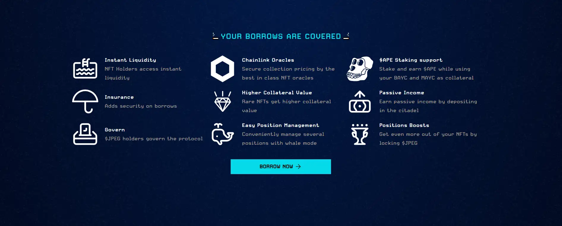 The platform’s design is rooted in decentralization, efficiency, and innovation. Governed by the $JPEG token, JPEG’d removes intermediaries, allowing any eligible NFT holder to borrow up to 70% of their asset's value. It further enhances value creation with features like Chainlink oracles for pricing, liquidation insurance, and ecosystem-native boosts that increase LTV (Loan-To-Value) through gamified mechanisms. JPEG’d positions itself as a powerful, capital-efficient protocol in the growing NFT-Fi movement.
