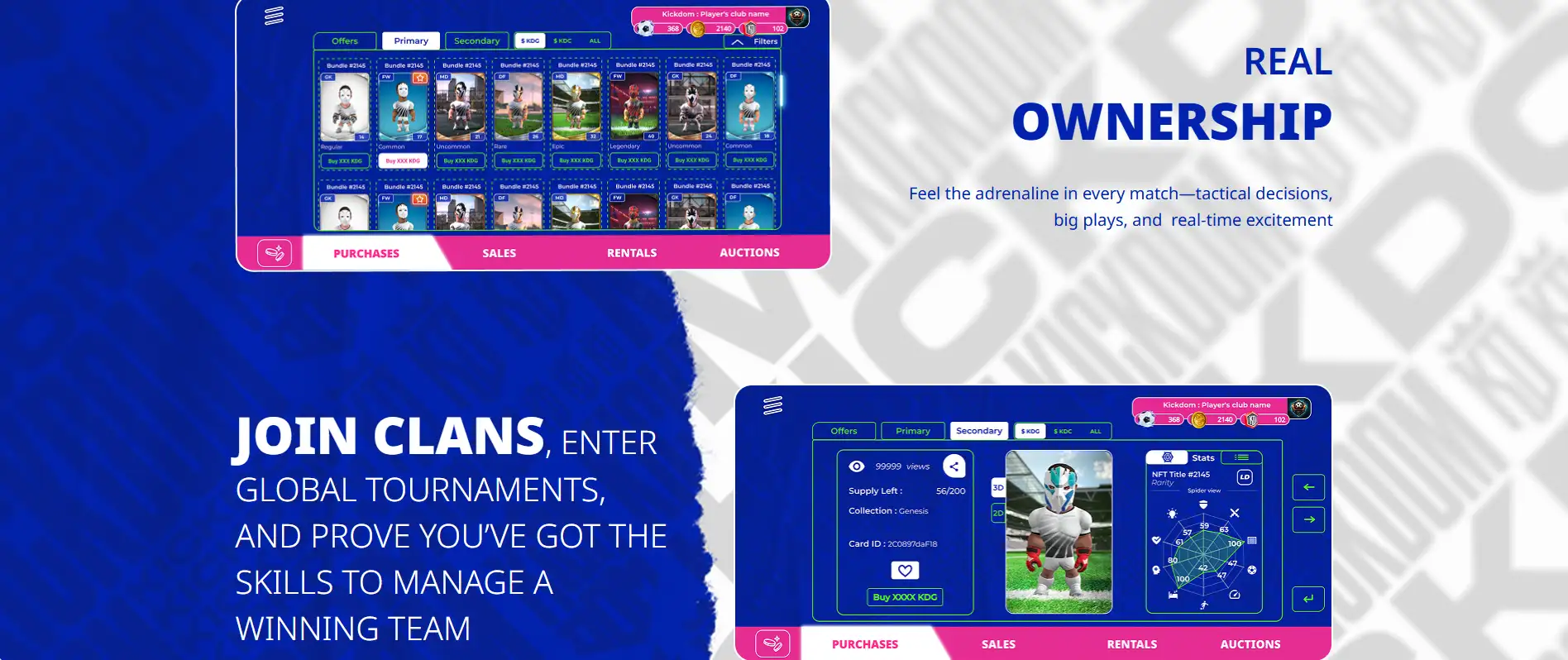 A key innovation of KickDom is its focus on real digital ownership. Assets such as players, stadium upgrades, and consumables can be owned, traded, and upgraded by users. This makes every in-game decision impactful and introduces an economy where rewards are more than just pixels—they’re real, ownable assets. KickDom isn't just a game—it's a platform for competition, investment, and community-driven evolution.