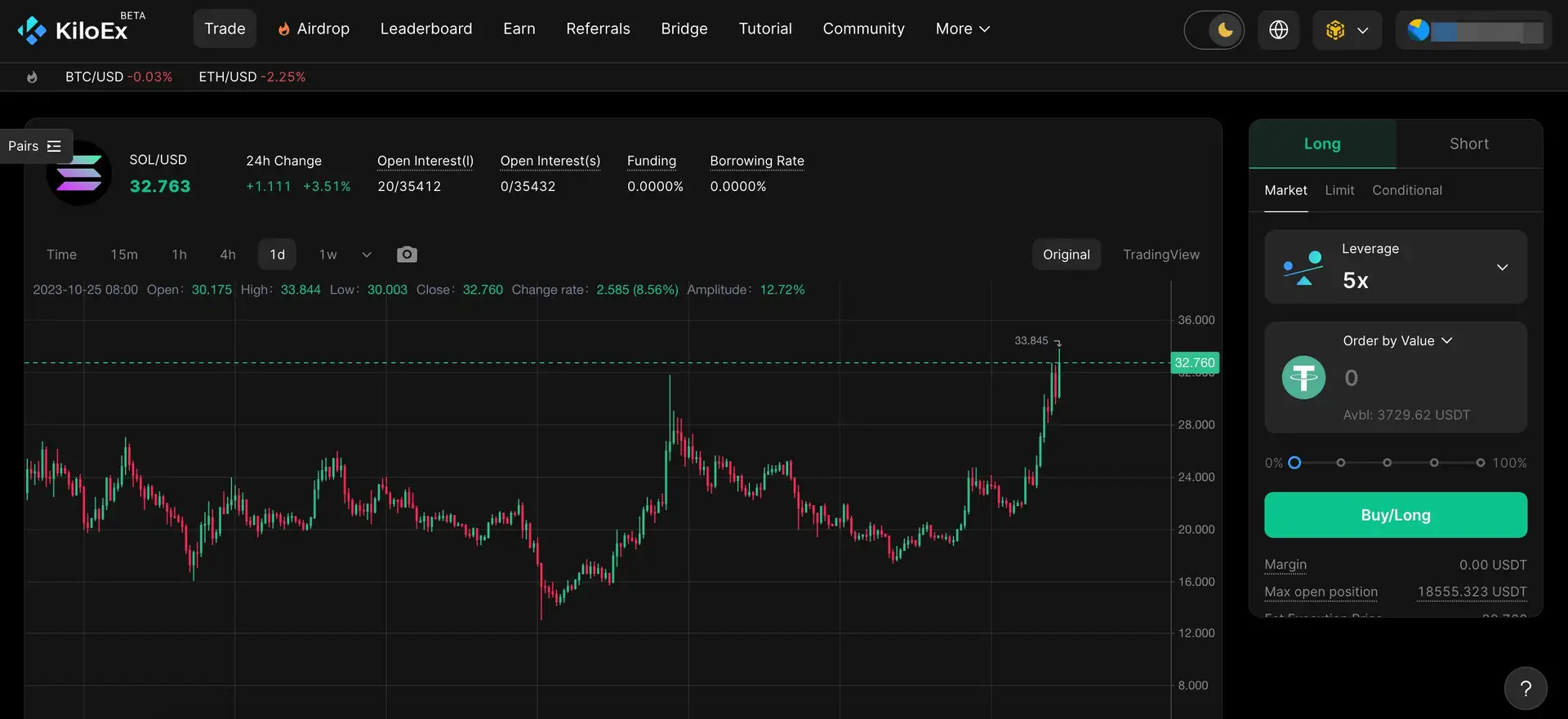 - Select a Trading Pair: Browse through the available trading pairs on KiloEx and choose the one you wish to trade. The platform supports a variety of pairs, providing ample liquidity for your trades.
