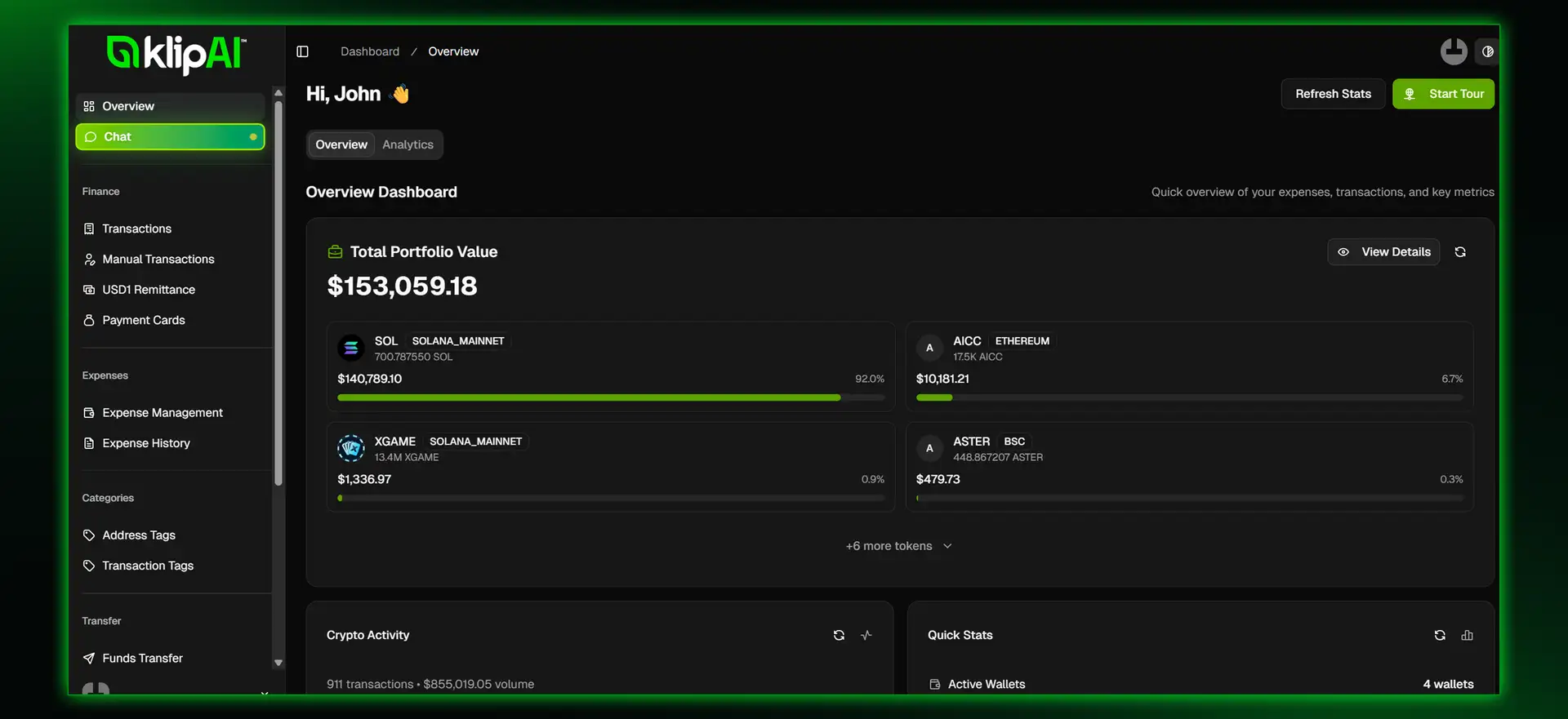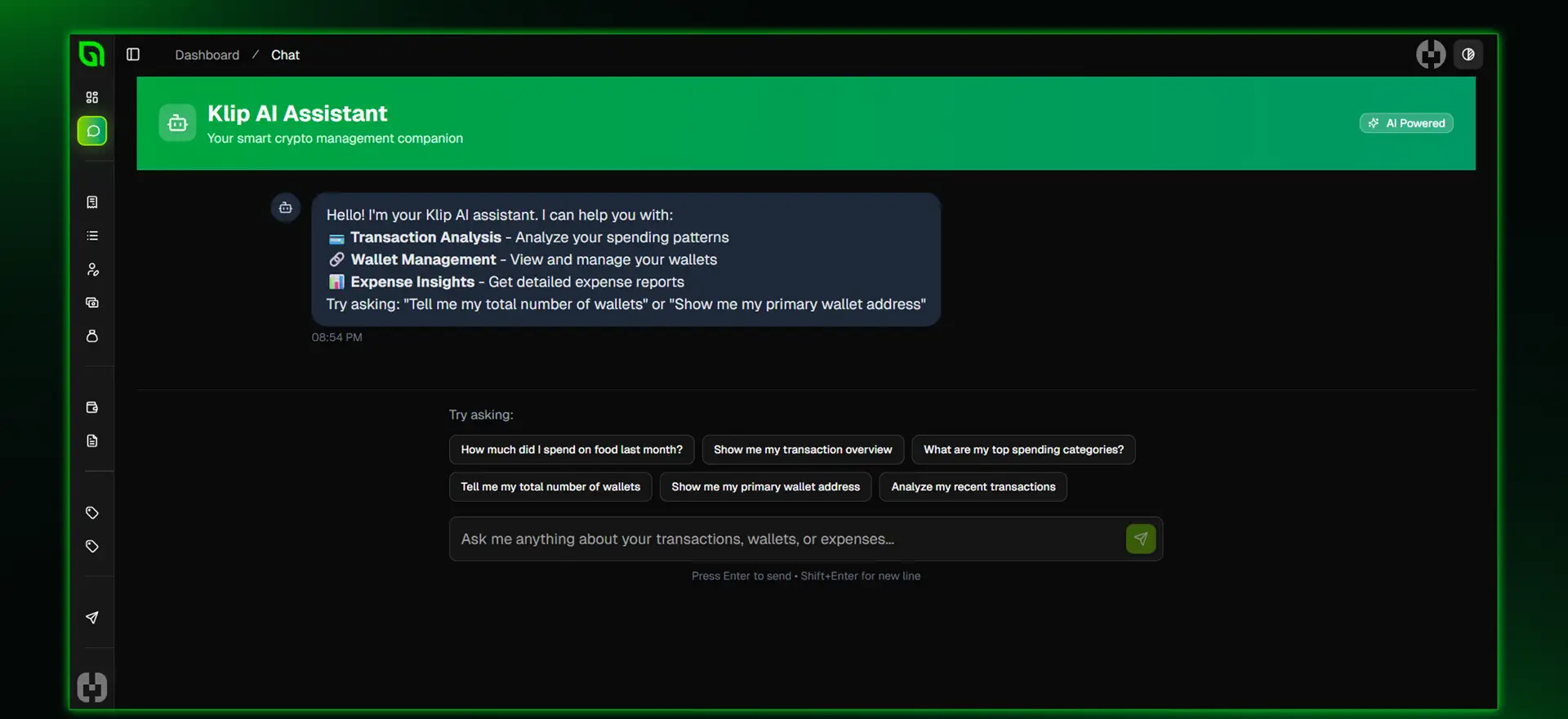 KlipAi is an AI-powered crypto wallet that lets you send money by username, track every transaction, and manage expenses across multiple wallets and chains. All from one clean dashboard.