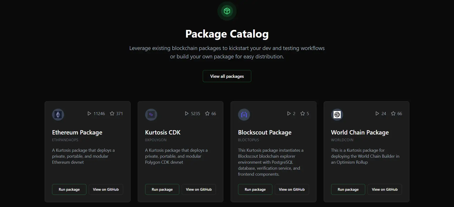 - Package Catalog: Use pre-built packages from projects like Ethereum, Polygon CDK, and Blockscout, or build and share your own reusable packages.