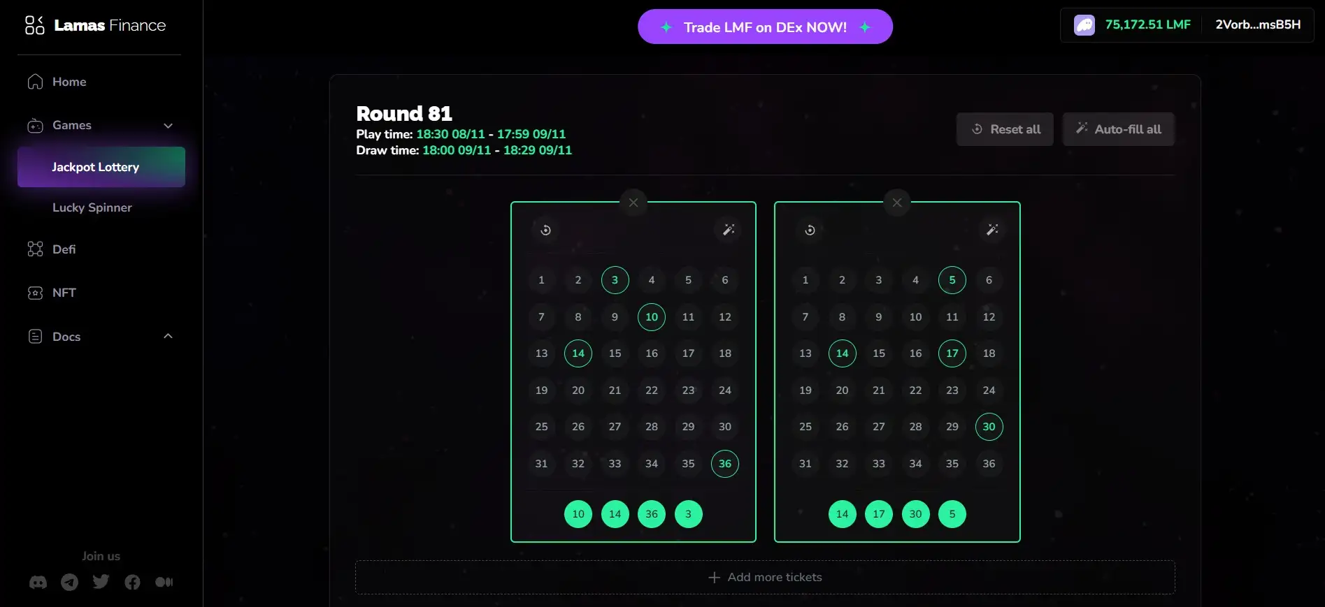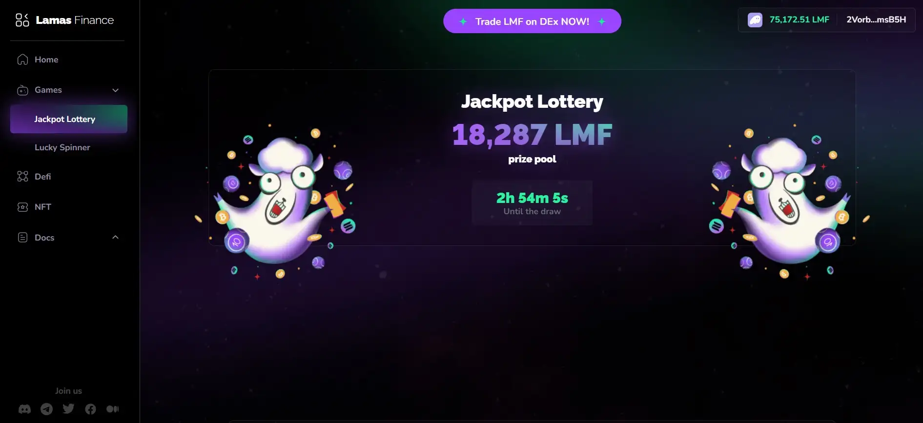 - Select the lottery pool you wish to enter and purchase tickets using your LMF tokens.