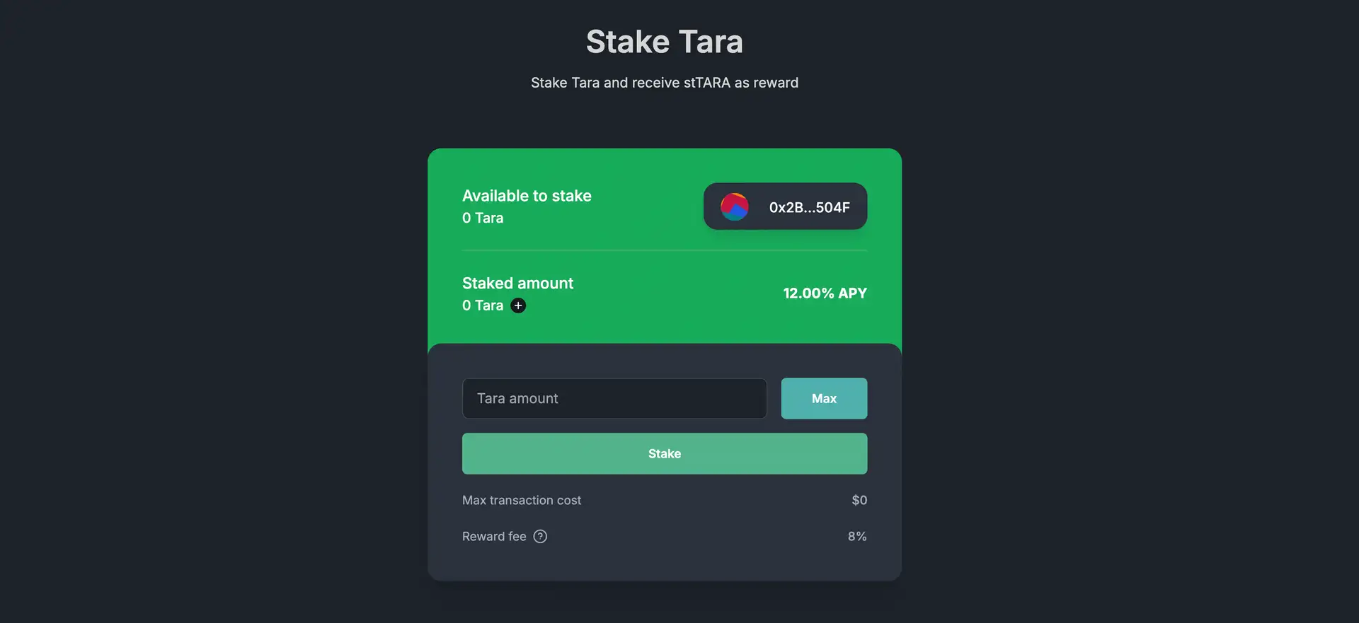 - Stake TARA: Choose your amount, approve the contract, and stake your tokens. You will immediately receive stTARA.