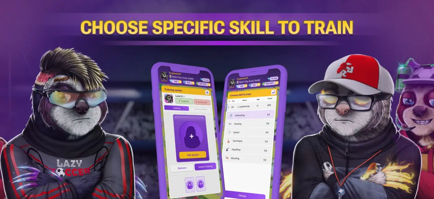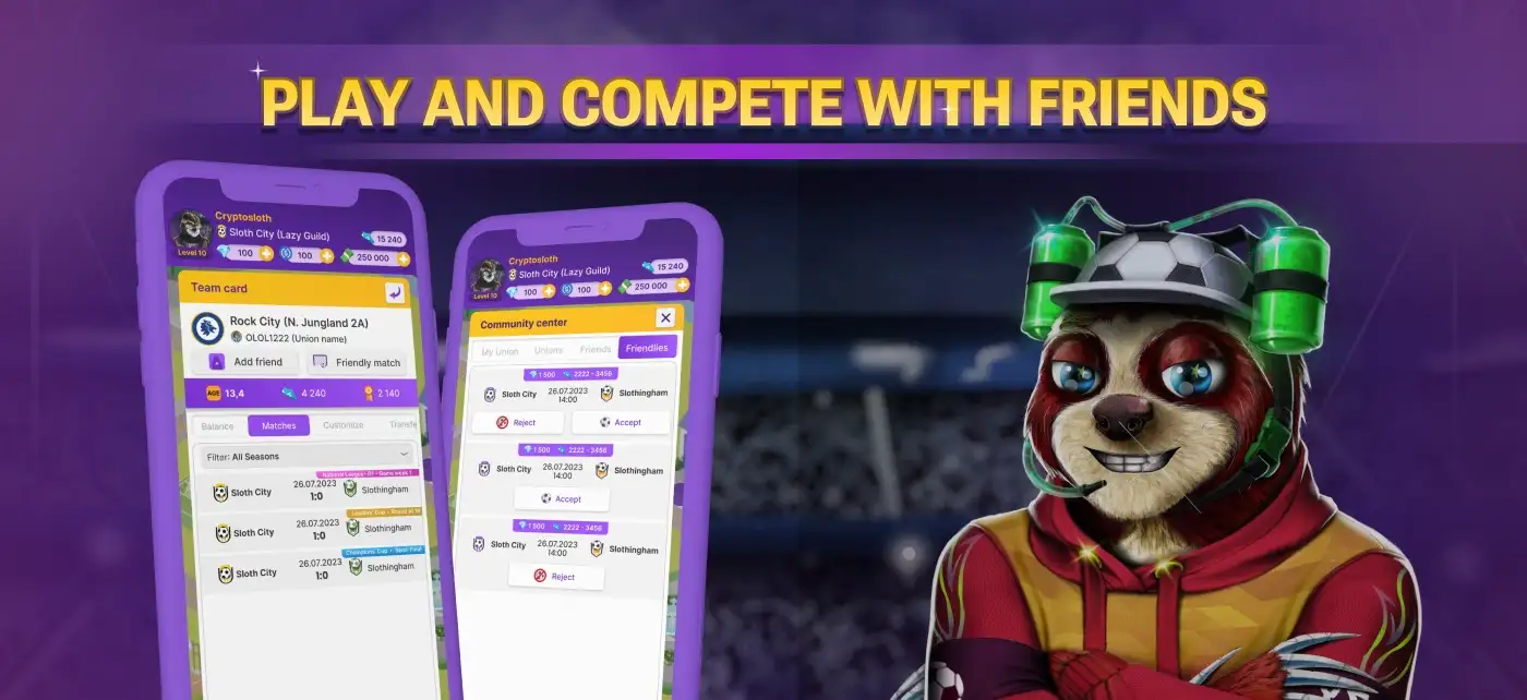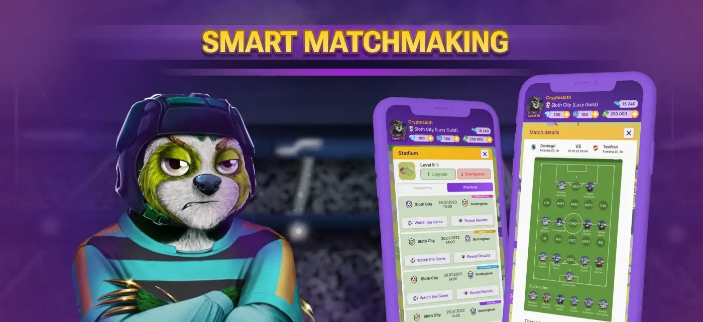 - Team Management: Build and customize your soccer team with NFT-based sloth players. Select a unique team name, logo, and kit, then train players to improve their skills and potential.