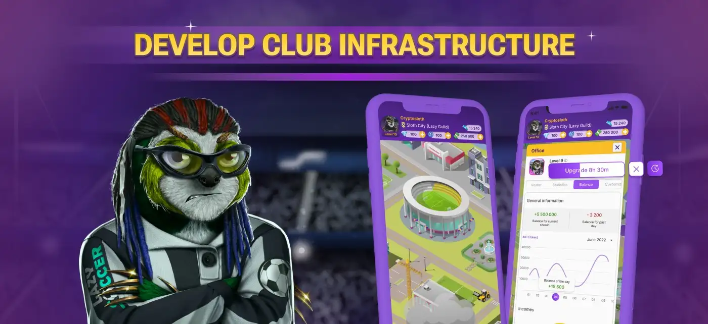 - Club Infrastructure: Construct and upgrade eight types of buildings, including stadiums, training facilities, and academies. Balance maintenance costs and use Lazy Staff NFTs to improve efficiency.
