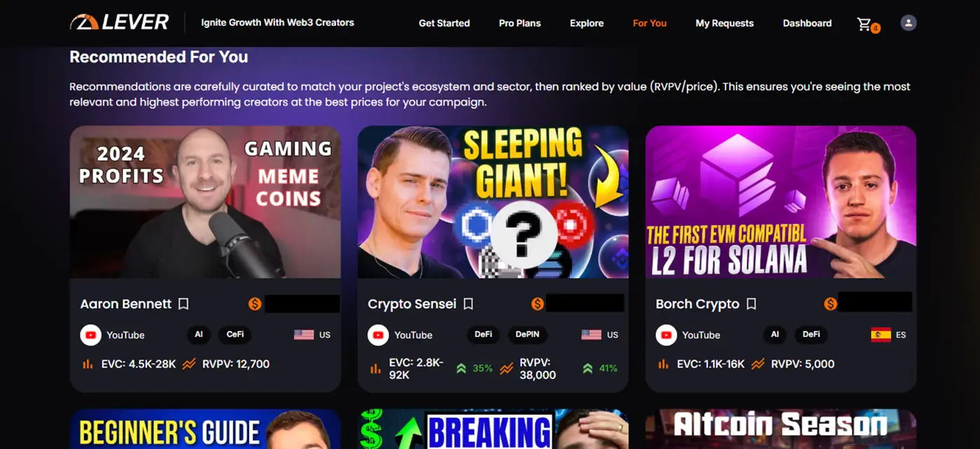 Each influencer’s profile on Lever.io provides detailed metrics, including subscriber counts, Expected View Count (EVC), Recent Views Per Video (RVPV), sector focus, ecosystem alignment, and more. This ensures that brands aren't guessing when choosing partners — they’re making data-backed decisions that maximize campaign ROI. Brands can filter creators by blockchain specialty, platform preference (YouTube, Twitter, TikTok, etc.), and even service types like AMAs or product reviews.