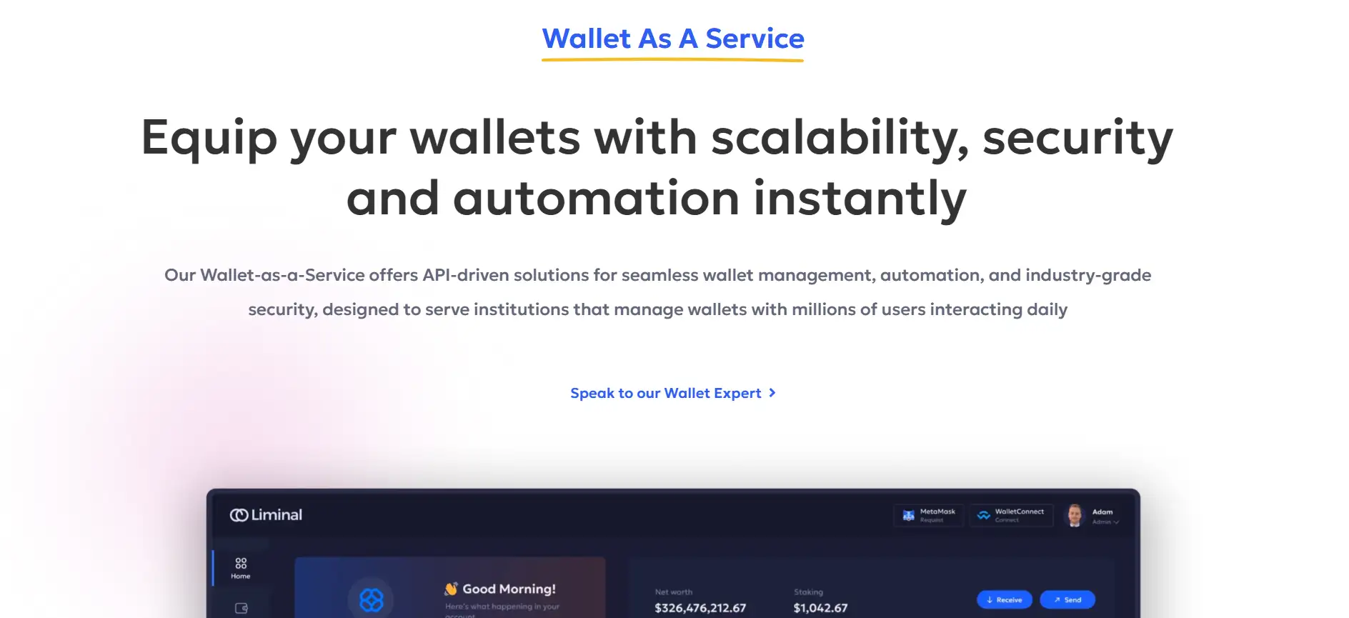 - Integrate your systems using Liminal’s API and SDK for Wallet-as-a-Service deployment.