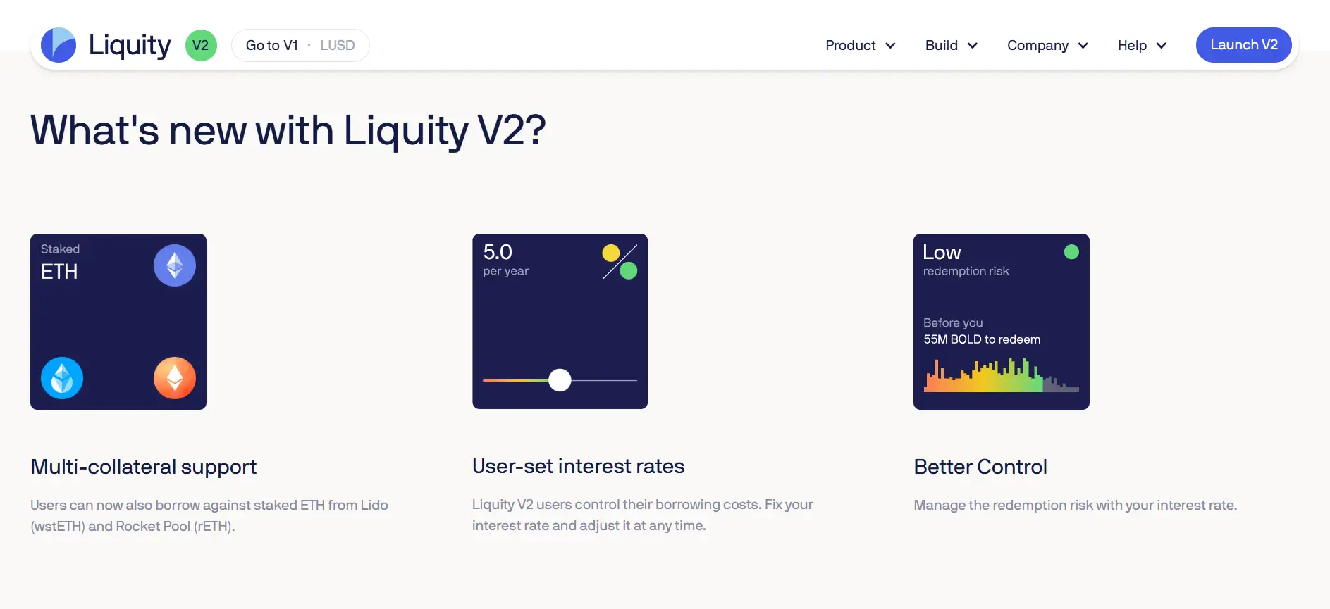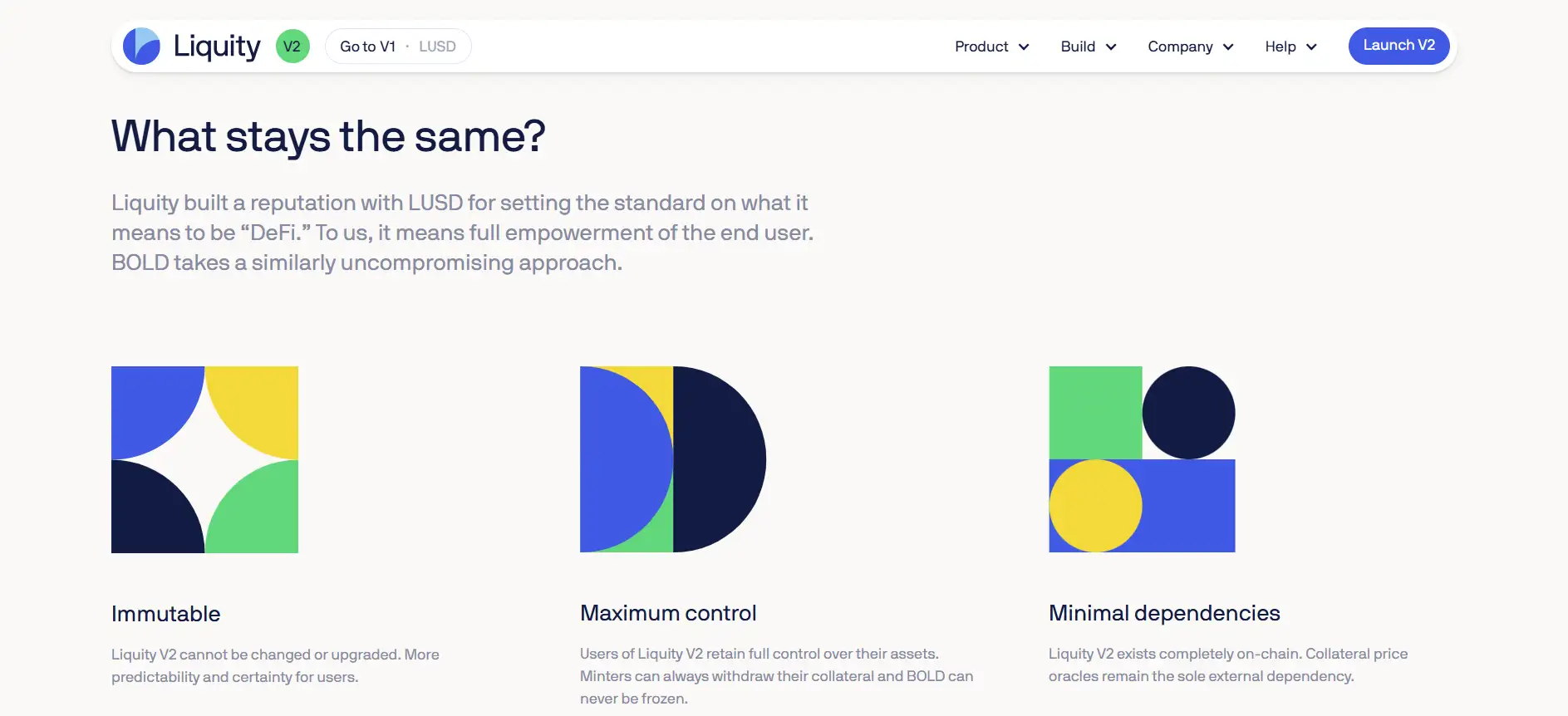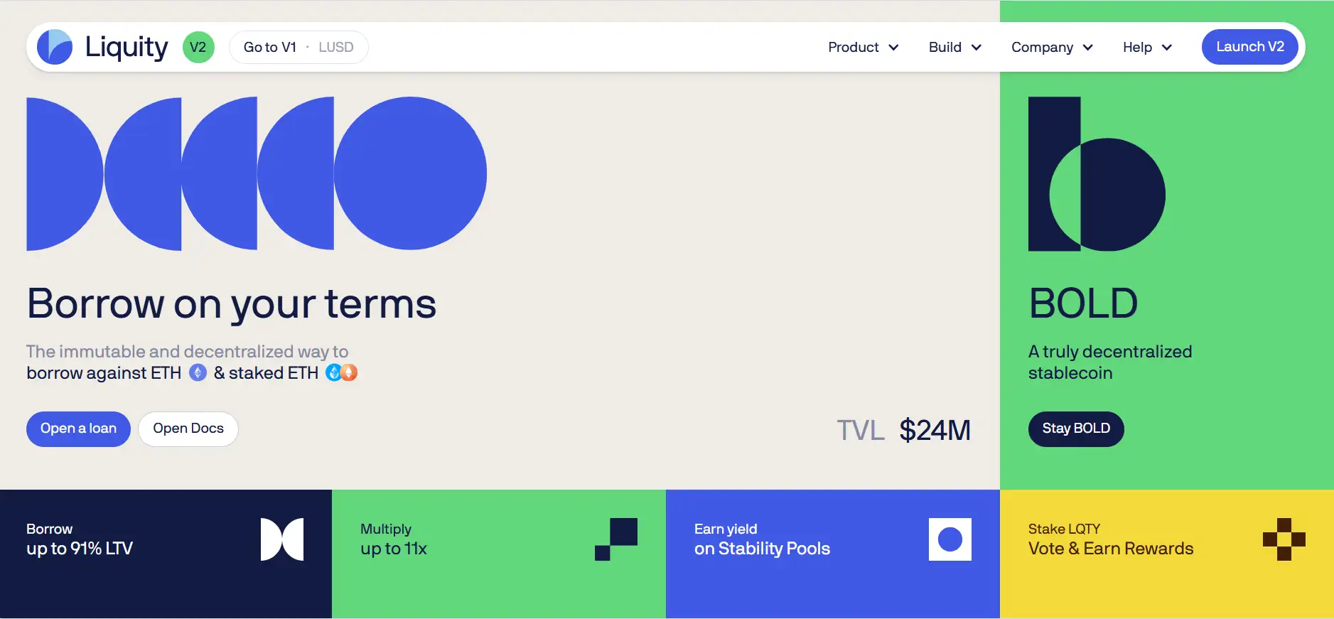 Liquity is a next-generation decentralized borrowing protocol that builds upon the foundation laid by its original version (V1), which pioneered a governance-free, immutable architecture in the DeFi landscape. With the release of Liquity V2, the protocol evolves even further, introducing innovations such as user-defined interest rates, multi-collateral borrowing, and sustainable on-chain yield. The protocol’s stablecoin, BOLD, offers a crypto-native alternative to traditional USD-backed stablecoins by being fully overcollateralized with decentralized assets—ETH, wstETH from Lido, and rETH from Rocket Pool.