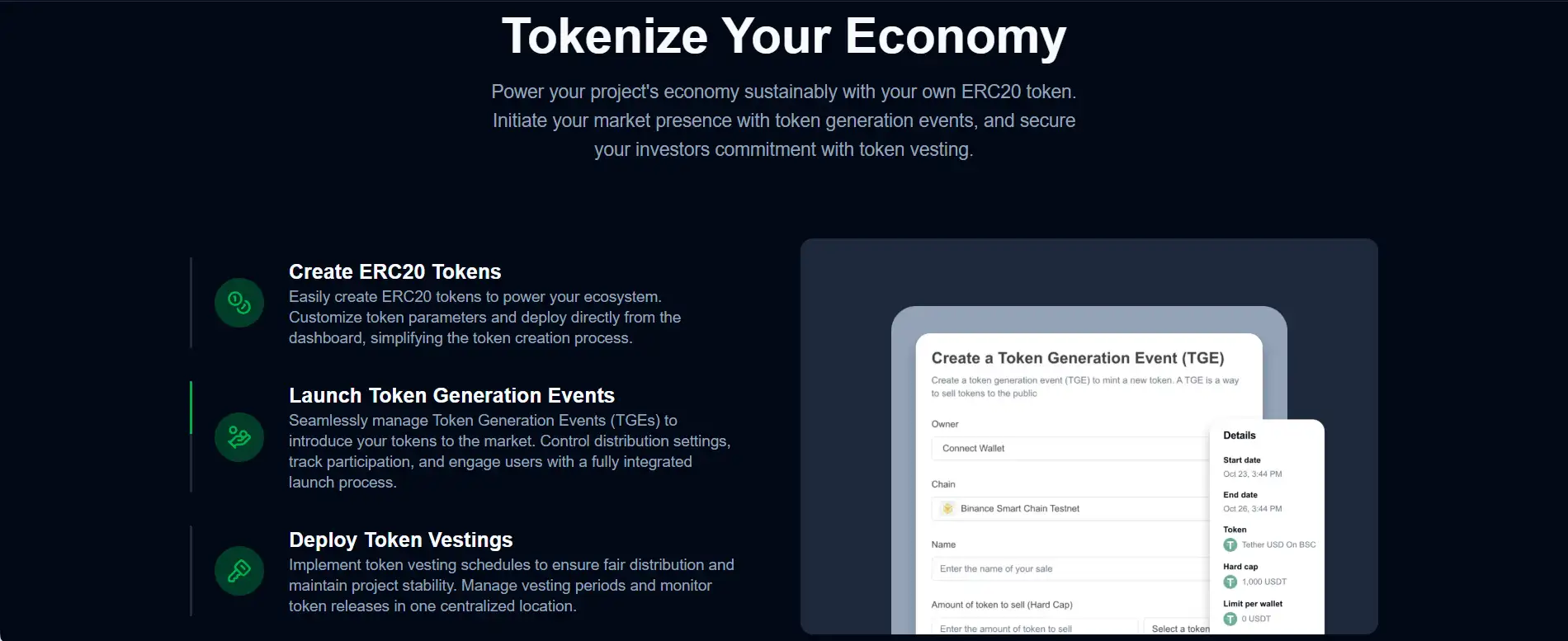 - Token Management: Create ERC20 tokens, run TGEs, and implement vesting schedules without coding.