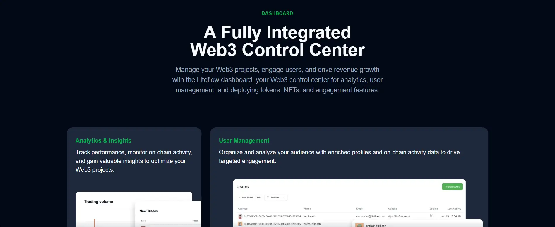 Liteflow offers an end-to-end solution for Web3 project owners who need a single control center to oversee their operations. Its dashboard functions as a command hub, allowing teams to monitor on-chain activity, analyze performance metrics, and manage both digital assets and community engagement in one place.