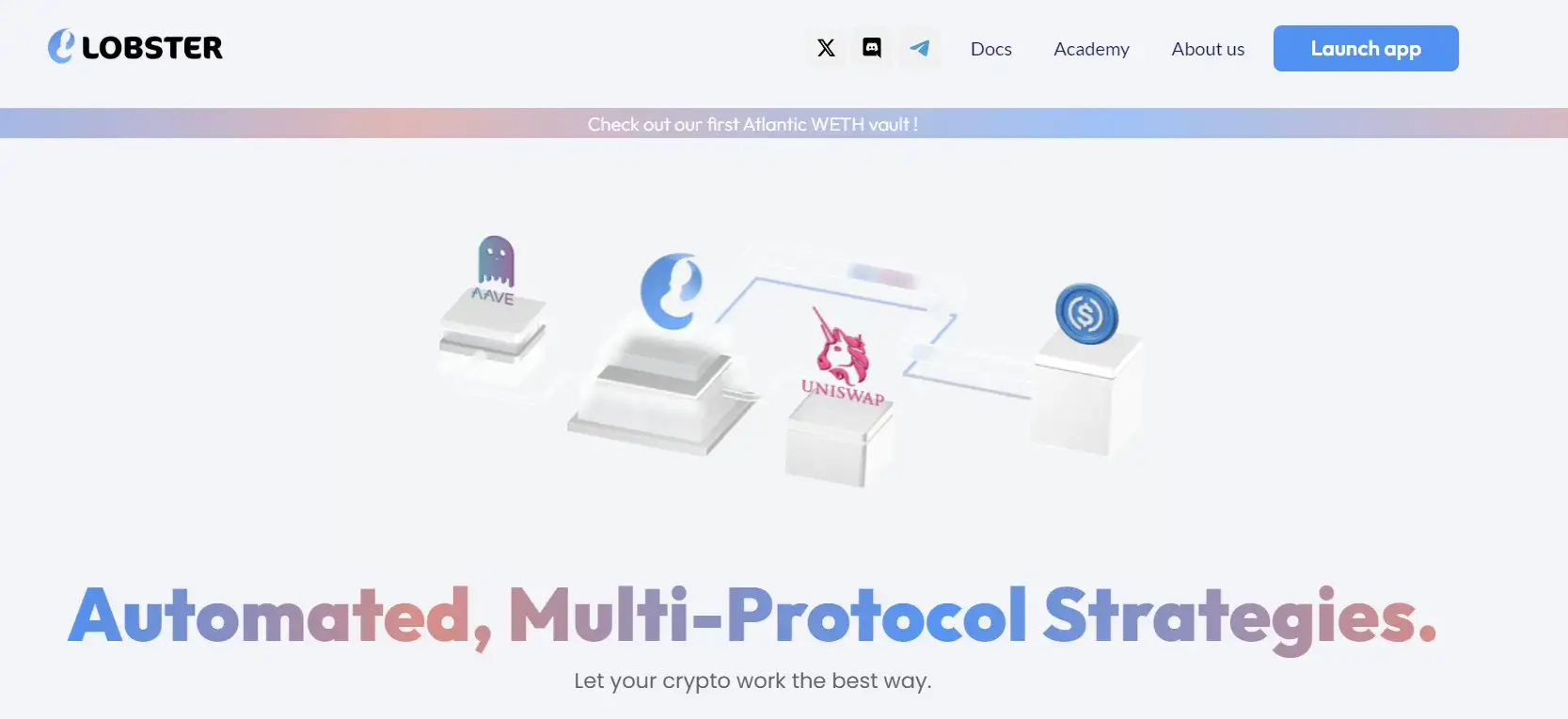 Lobster Protocol is a cutting-edge DeFi platform designed to revolutionize how users manage and optimize their crypto investments. Leveraging the power of automated, multi-protocol strategies, Lobster offers a seamless and efficient way to invest in decentralized finance with minimized risk and maximized returns. This protocol stands out by enabling users to deposit their assets into non-custodial vaults, where advanced algorithms manage these funds across multiple trusted DeFi protocols such as Uniswap v3 and AAVE v3.