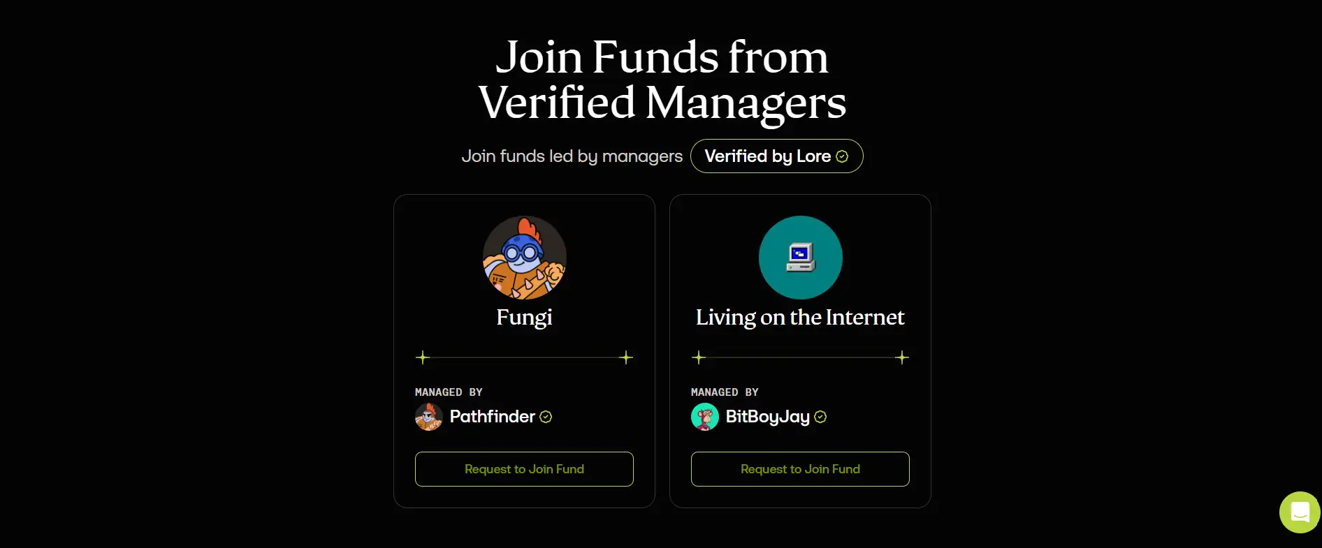 Yes. Lore enables you to launch a private fund for friends, manage capital collectively, and track results. Once you’ve proven your performance, you can open the fund to the public, attract more capital, and earn 20% of profits while retaining full control of your community and brand.