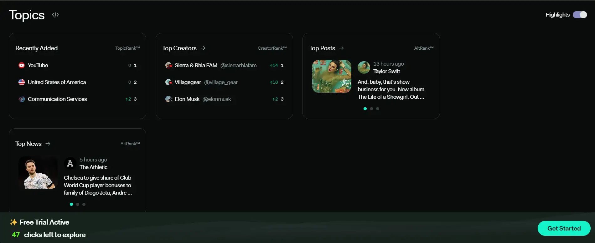 - Trending Topics: Understand the fastest-growing narratives across social platforms to capture early signals before they become mainstream.