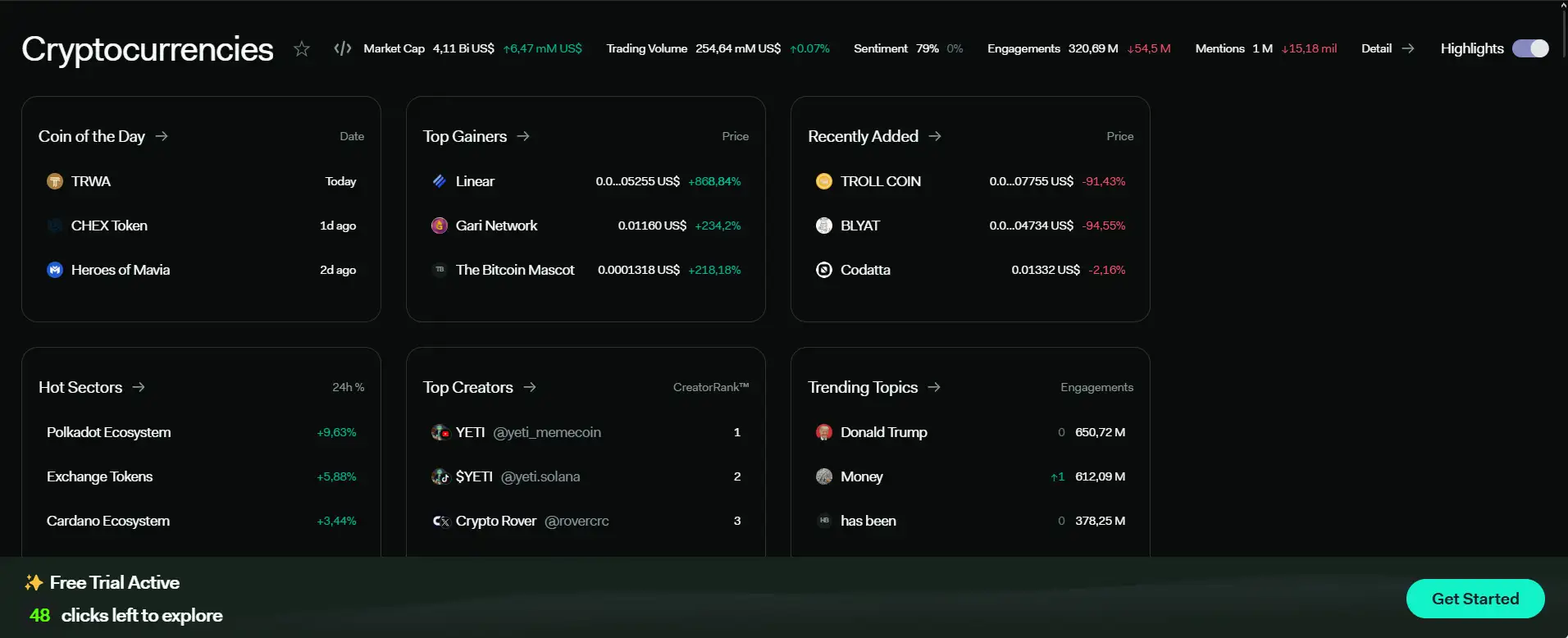 - Comparison Tools: Analyze assets side-by-side using market metrics, social mentions, and sentiment scores to find breakout projects.