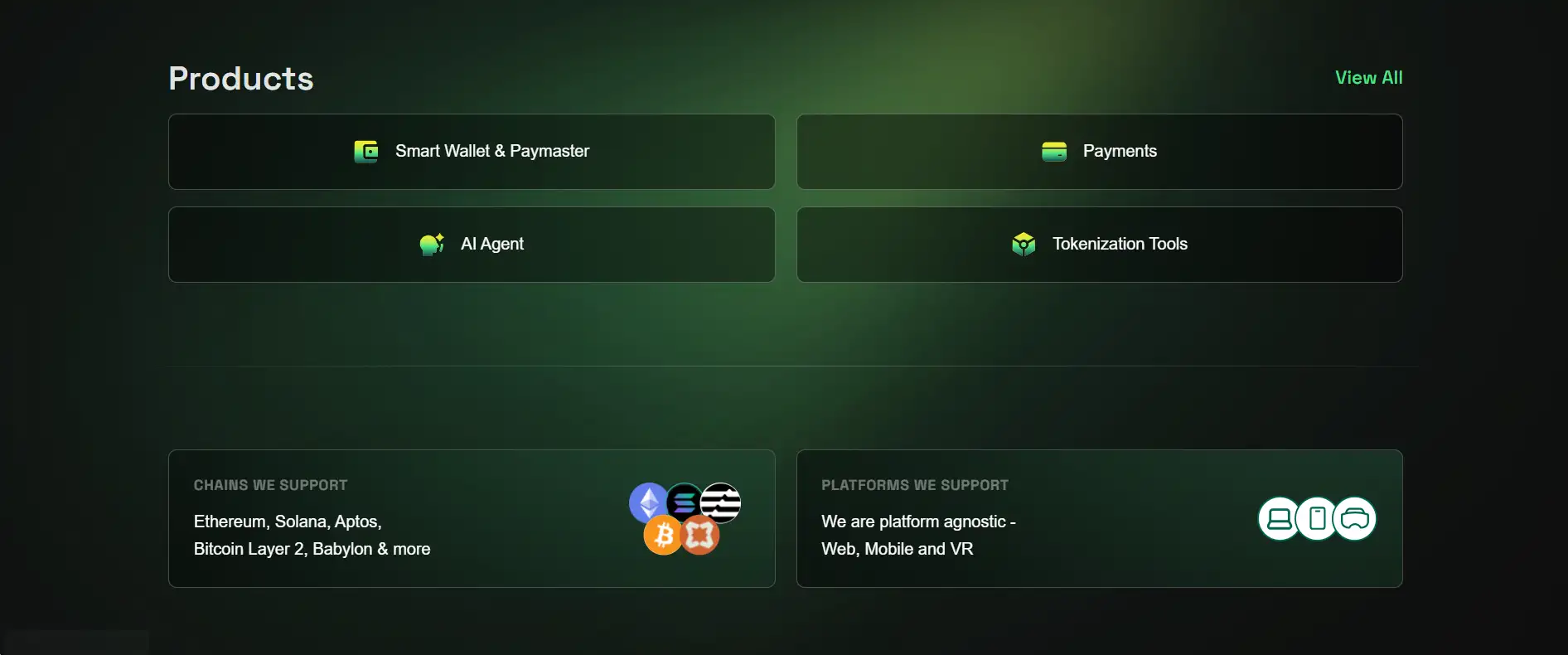 - Smart Wallets & Payments: Enable social logins, gasless transactions, and fiat/crypto rails for seamless onboarding.