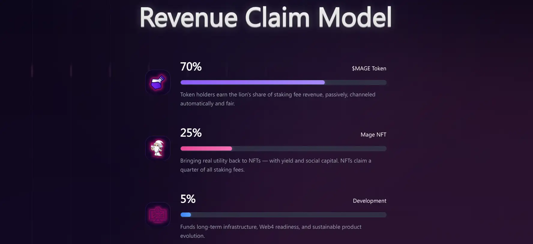 - Claimable Yield in SOL: Rewards from staking $MAGE or Mage NFTs are paid in SOL, not illiquid tokens, supporting real, recurring yield.