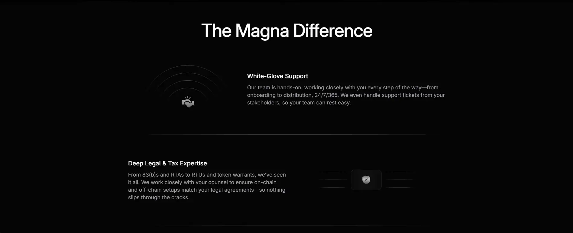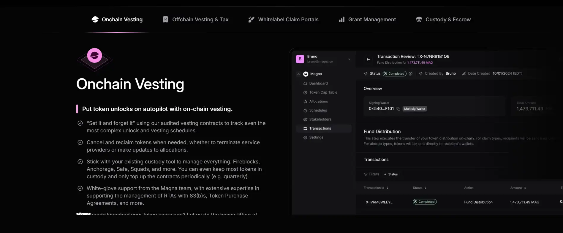 From managing dynamic custody and executing milestone-based grants to providing white-labeled claim portals, Magna enables founders to move fast while maintaining institutional-grade security and compliance. Backed by top investors and integrated with leading Web3 infrastructure such as Fireblocks, Safe, Anchorage, and Squads, Magna has become a trusted solution for high-growth Web3 teams looking to manage their token lifecycles with precision and flexibility.