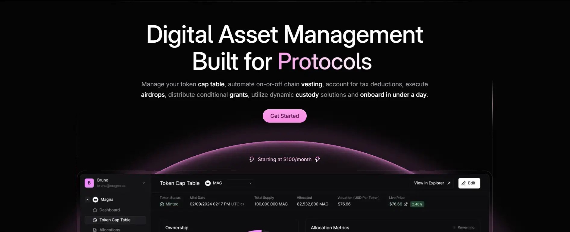 Magna is a full-stack digital asset management platform built for the operational needs of Web3 founders, protocols, investors, and finance teams. It simplifies the complex world of token distribution, cap table management, vesting schedules, and airdrops into a single, secure platform. Designed for both on-chain and off-chain use cases, Magna streamlines operations, removes legal and tax friction, and accelerates go-to-market readiness for tokenized projects.
