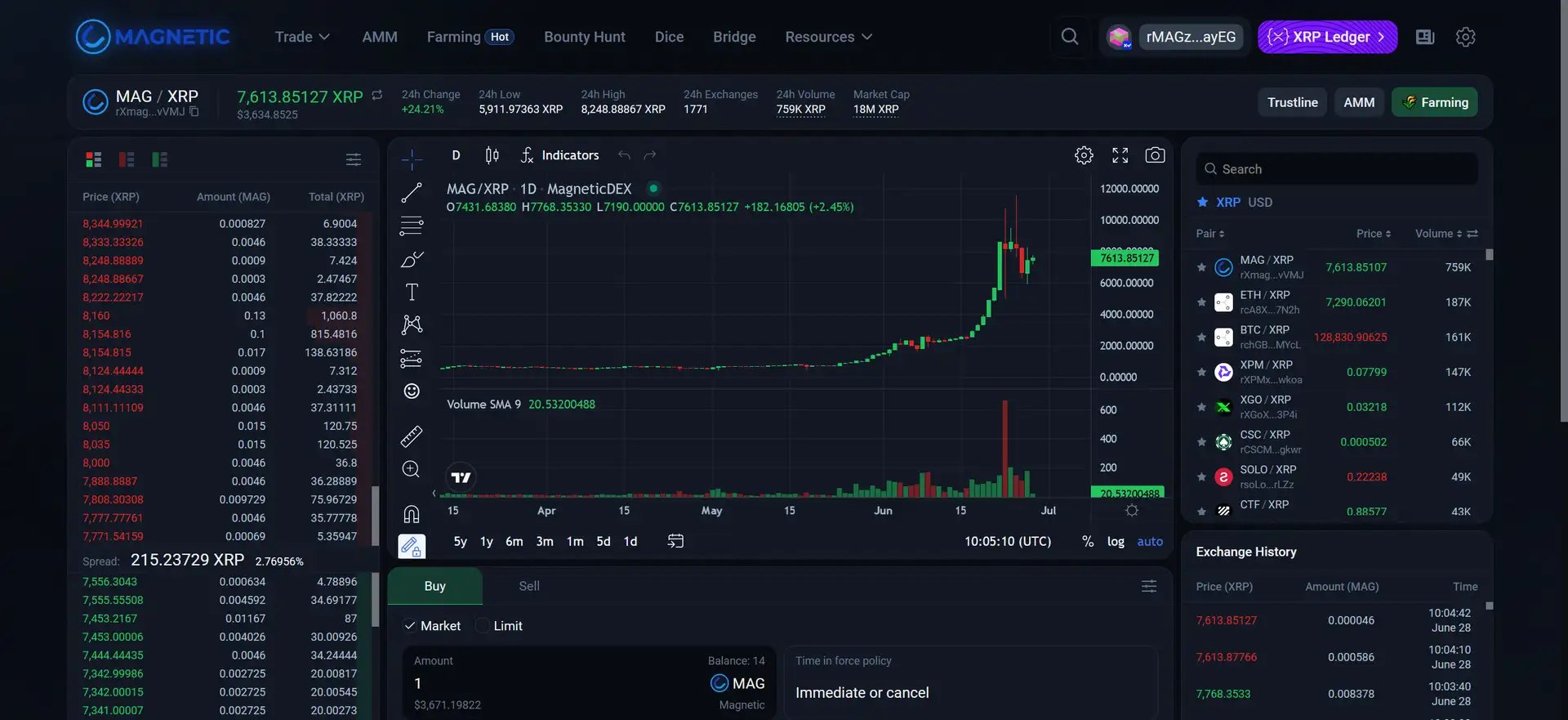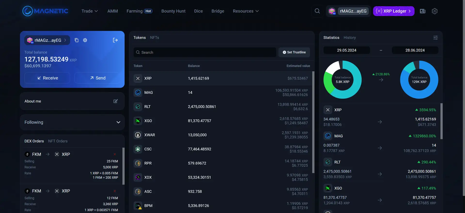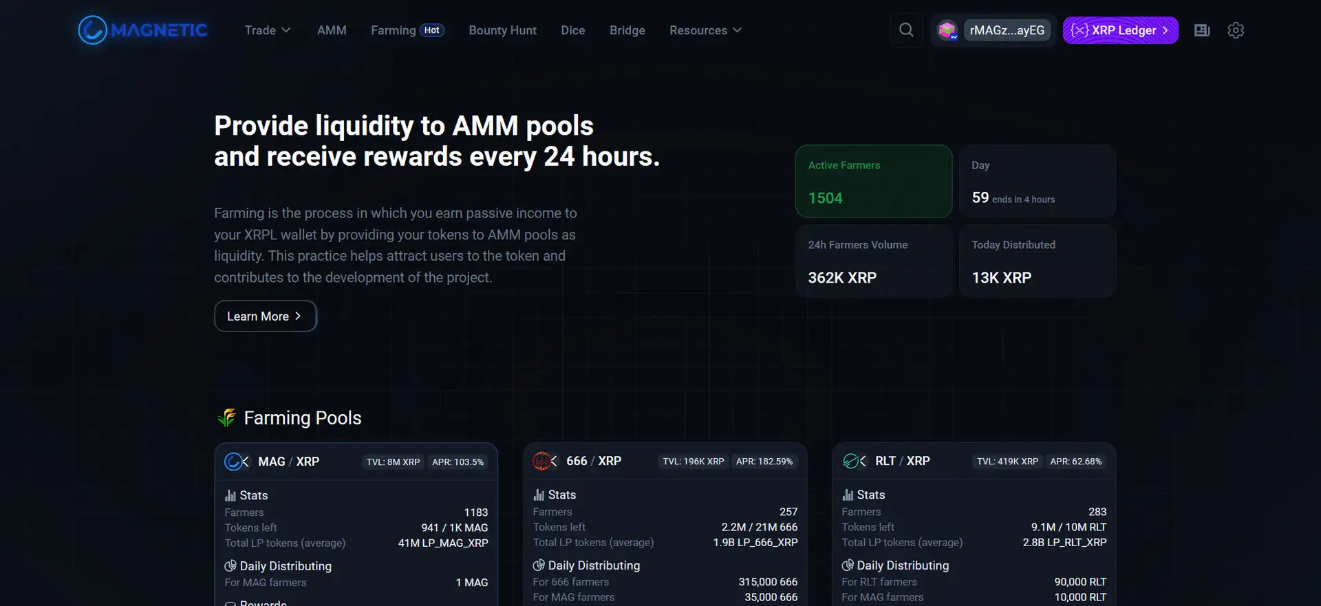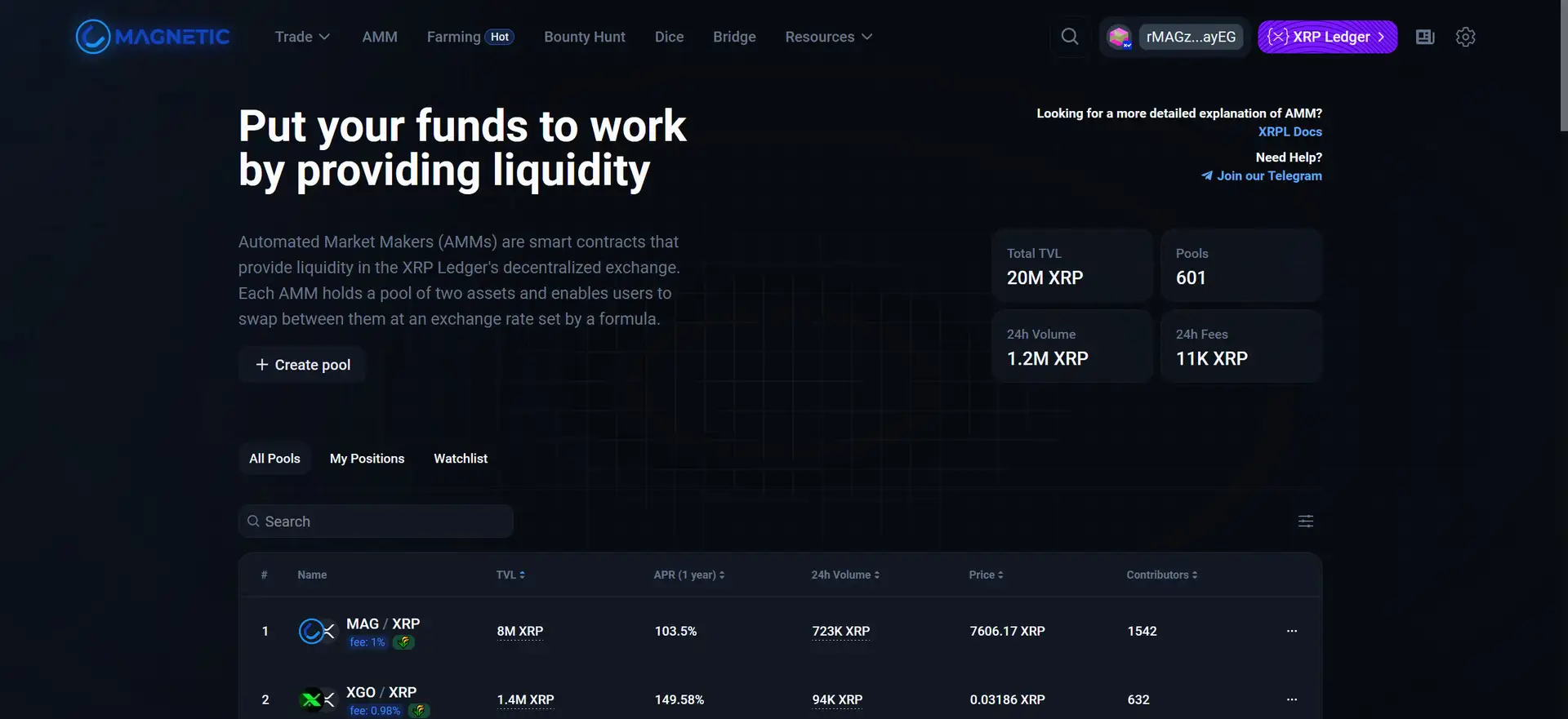Magnetic is a pioneering platform leveraging the XRPL (XRP Ledger) to provide an all-encompassing suite of decentralized finance (DeFi) services. It offers a decentralized exchange (DEX), automated market making (AMM), farming, and NFT marketplace features, all within a single, user-friendly ecosystem. The platform's design ensures that users can seamlessly swap tokens, engage in liquidity provision, and trade digital assets, making it a comprehensive solution for both seasoned traders and newcomers to DeFi.