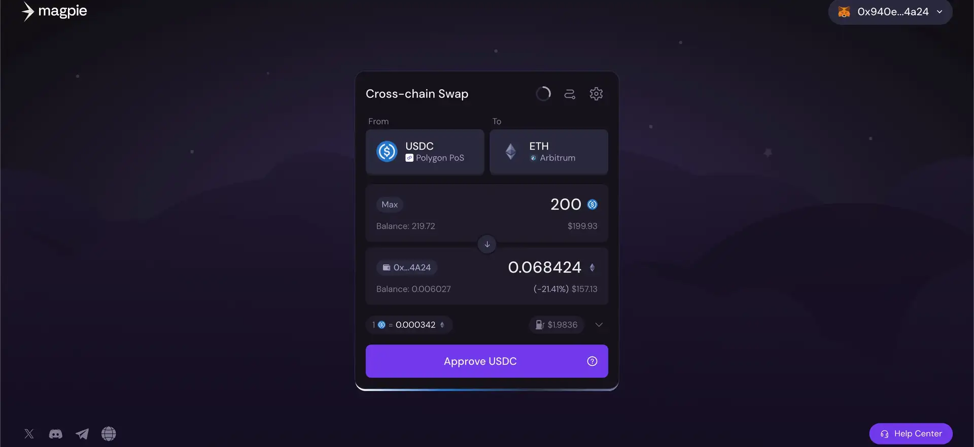 - Select Swap: On the Magpie Protocol platform, choose the source and destination blockchains, the tokens you wish to swap, and the amount. The interface is designed to be intuitive, guiding you through each step.