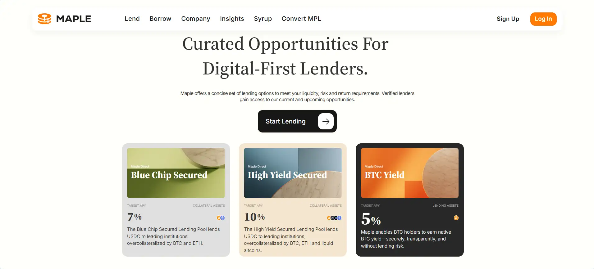 Maple Finance is a leading digital asset lending platform built for institutional capital markets. Combining on-chain transparency with credit market infrastructure, Maple redefines secured lending by offering fully collateralized loans, real-time risk monitoring, and permissioned pool access for verified lenders.