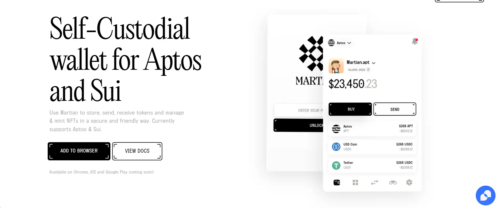 Martian Wallet is a self-custodial wallet designed for users of the Aptos and Sui blockchain networks. It enables secure storage, transfer, and management of digital assets while providing direct access to dApps, NFTs, and staking—all from a sleek and user-friendly interface. Martian Wallet is currently available as a Chrome extension, with mobile apps for iOS and Android coming soon.