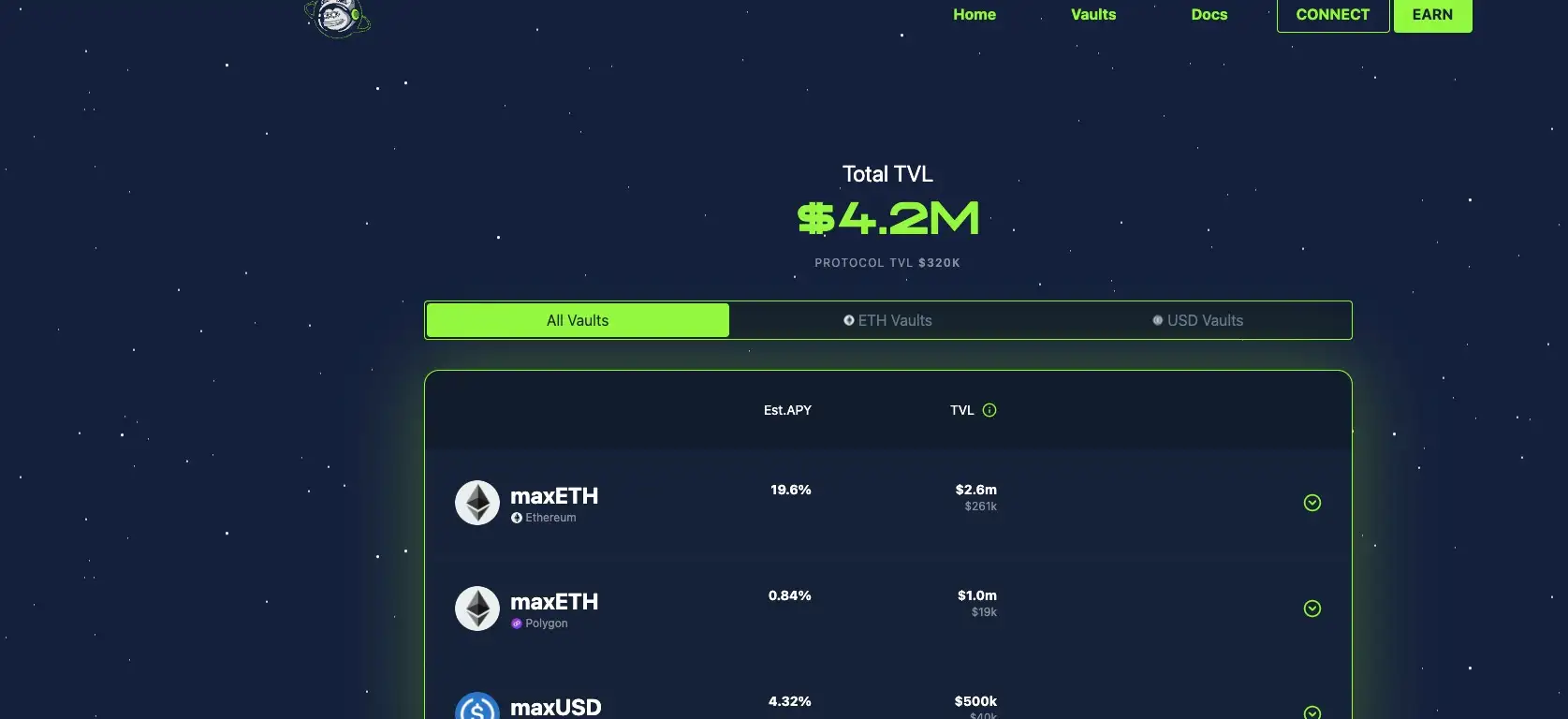 The platform is built on a straightforward yet highly efficient model: 1 asset = 1 vault. Users can deposit ETH or USDC into a designated vault, eliminating the need to manage multiple platforms or manually search for the best opportunities. maxAPY’s system continuously scans 100+ DeFi strategies across multiple EVM chains, automatically reallocating funds to the most profitable and secure options.