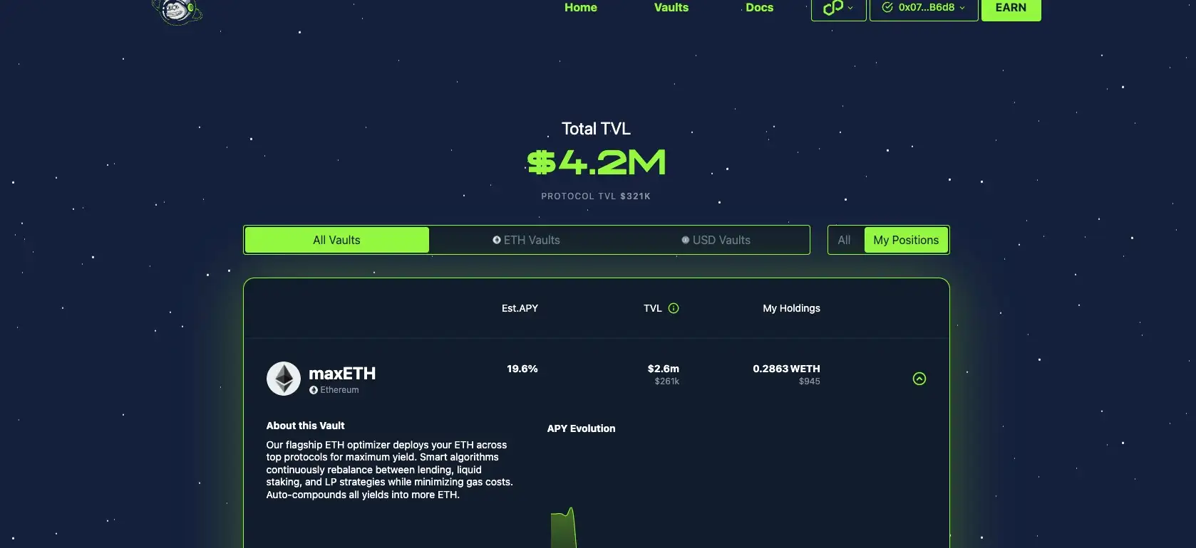 - Monitor your earnings: Track earnings in real-time through the vault dashboard. No manual management is required—maxAPY optimizes everything.