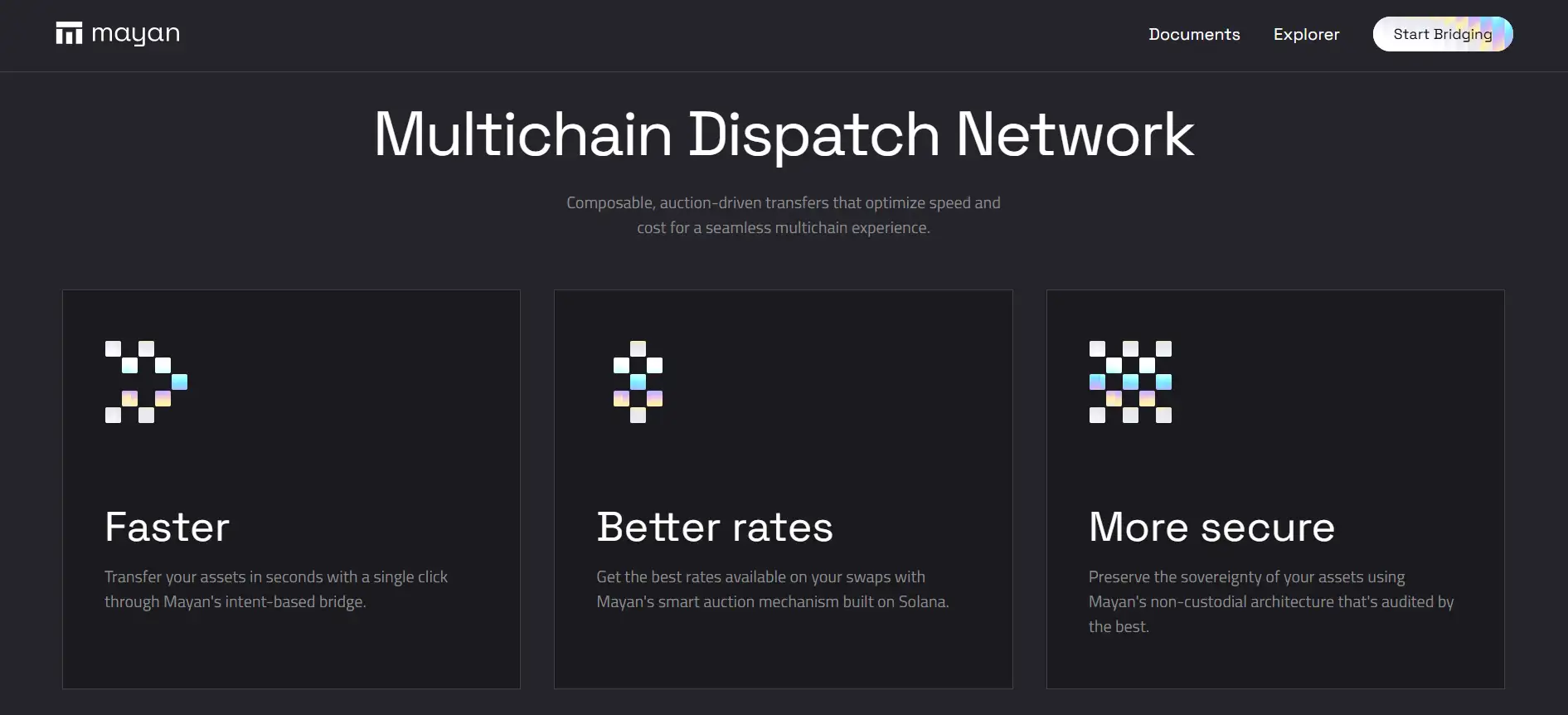 Mayan Finance is a cross-chain auction-based protocol designed to enable ultra-fast, secure, and cost-effective asset transfers across different blockchains. Built on top of the Solana network, Mayan Finance offers an intent-based bridging experience that allows users to swap assets in seconds with the best rates on the market, all through a fully non-custodial system.