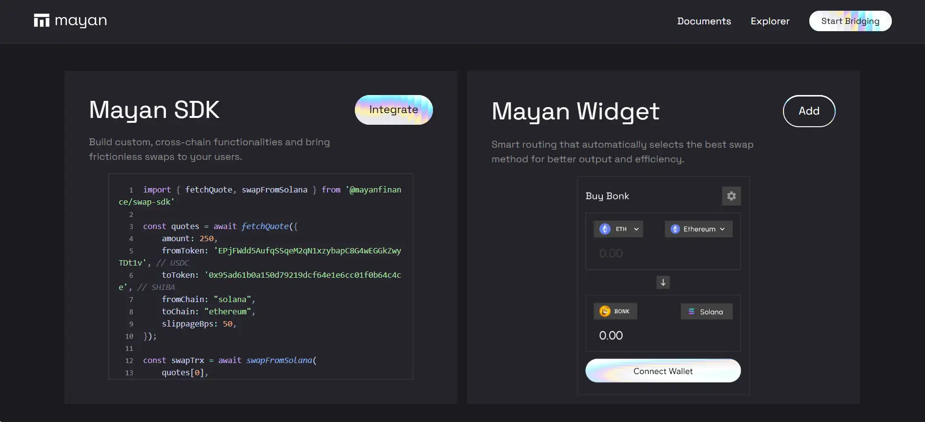 - Developer SDK & Widget: Integrate Mayan’s bridging logic with just a few lines of code using the Mayan SDK or embedded widget.