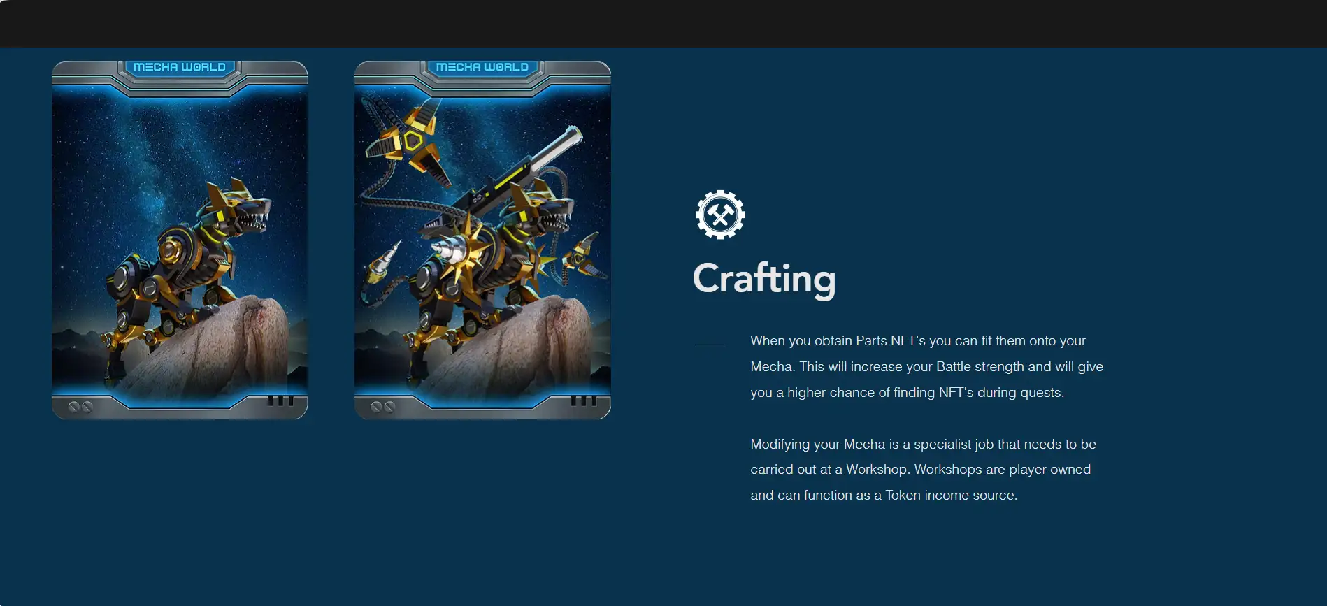 At the core of Mecha World is its unique player-driven economy. Since every in-game asset is an NFT, players have the ability to buy, sell, and trade their Mechas freely in a decentralized marketplace. The game also features a crafting system where players can collect resources, upgrade their Mechas, and enhance their abilities to gain an edge in battles. The integration of blockchain technology ensures that all transactions are transparent, secure, and immutable.