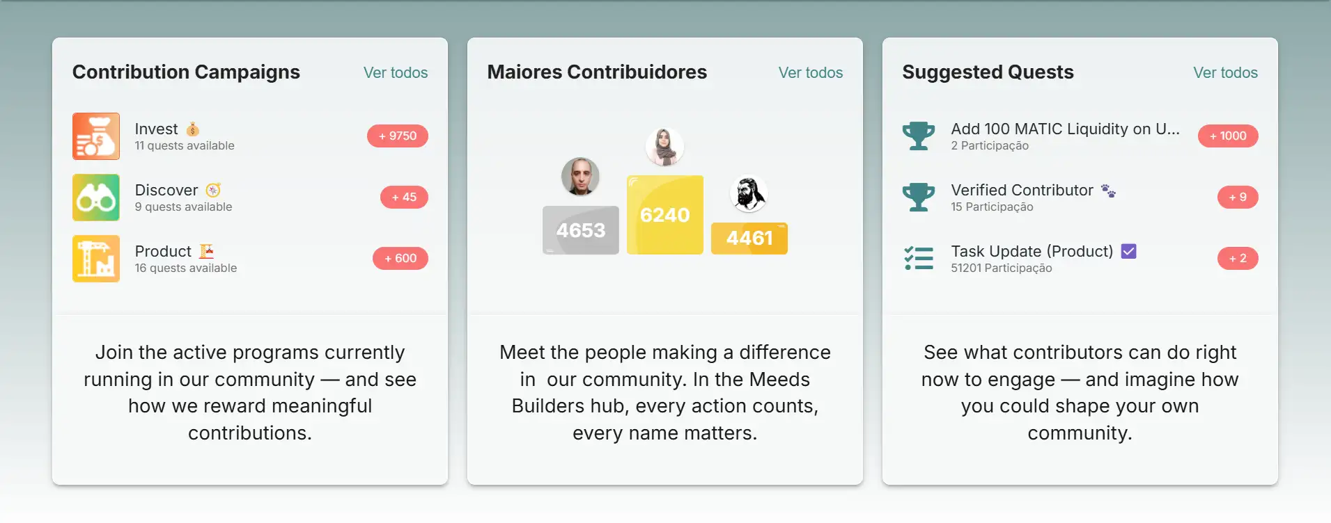 Whether you're building a developer collective, running a DAO, or coordinating volunteers, Meeds equips community leaders with the tools they need to engage contributors meaningfully. By offering gamified actions, contributor dashboards, token integrations, and customizable hubs, Meeds supports the full lifecycle of an engaged, decentralized community. Its open infrastructure and token-enabled features, such as $MEED rewards and DEED NFT-based hub access, position it as a forward-thinking solution for organizations committed to sustainable, contribution-first community growth. Explore more at Meeds.io.