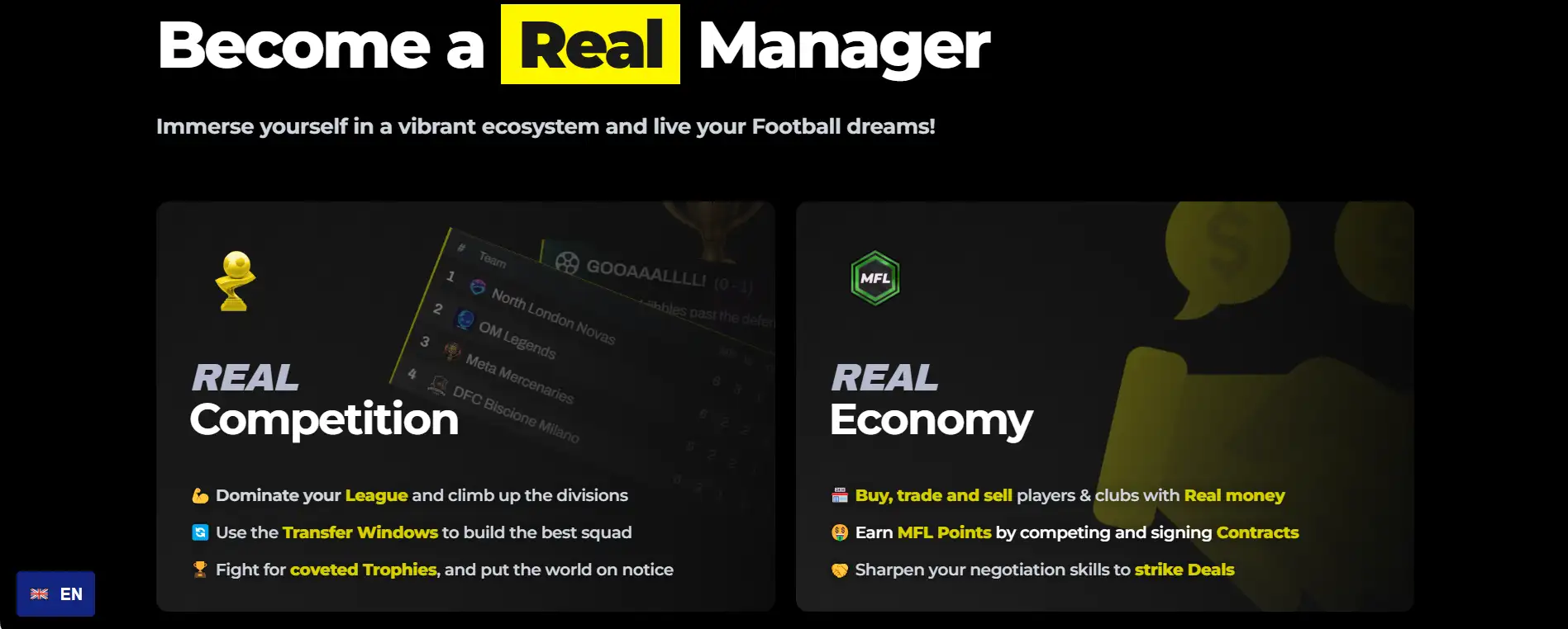 - In-Game Economy: Earn $MFL by competing, signing contracts, or selling NFTs. Use it to purchase packs or enter competitions. The value is pegged to in-game items (800 $MFL = $1 USD).