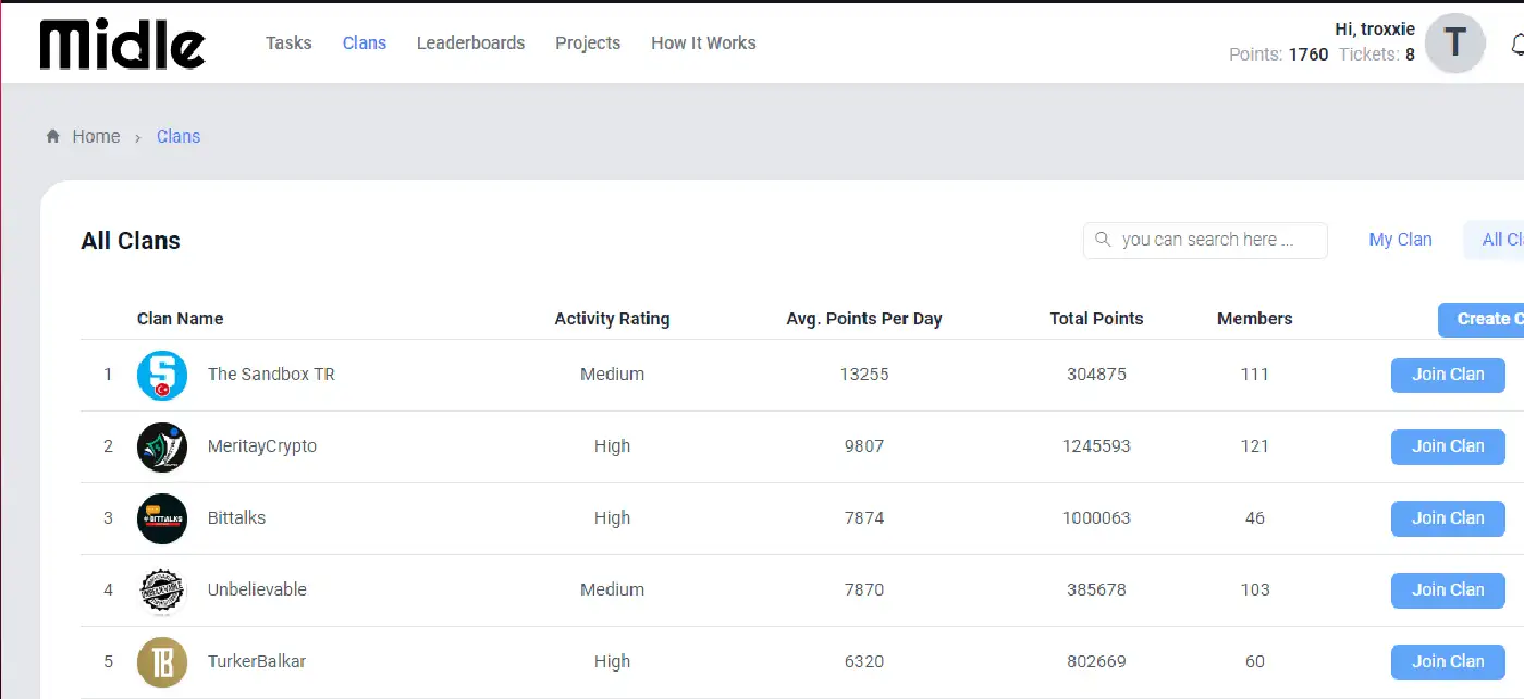 Clans play a pivotal role in Midle’s reward system by fostering a collaborative environment where users can work together to achieve better results. By joining or creating a clan, users can earn additional rewards, climb the leaderboard more effectively, and participate in exclusive clan-based competitions. This system not only enhances user engagement but also promotes teamwork and sustained activity on the platform.