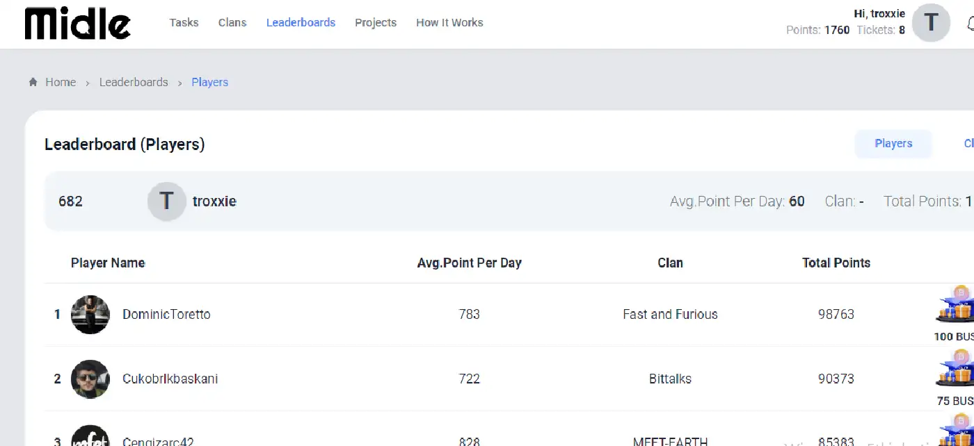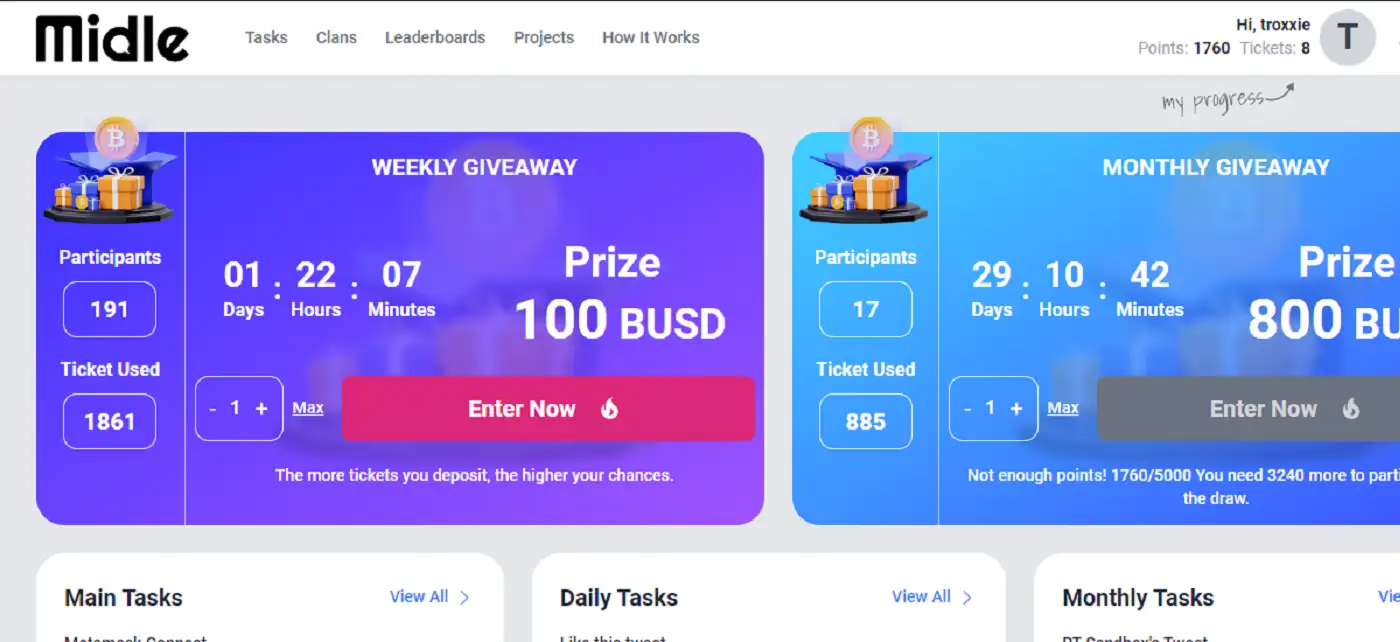 - Participate in Tasks: Start completing tasks to earn points, which can be converted into tickets or used to climb the leaderboard. Points can also be exchanged for Midle tokens, providing you with additional value for your efforts.
