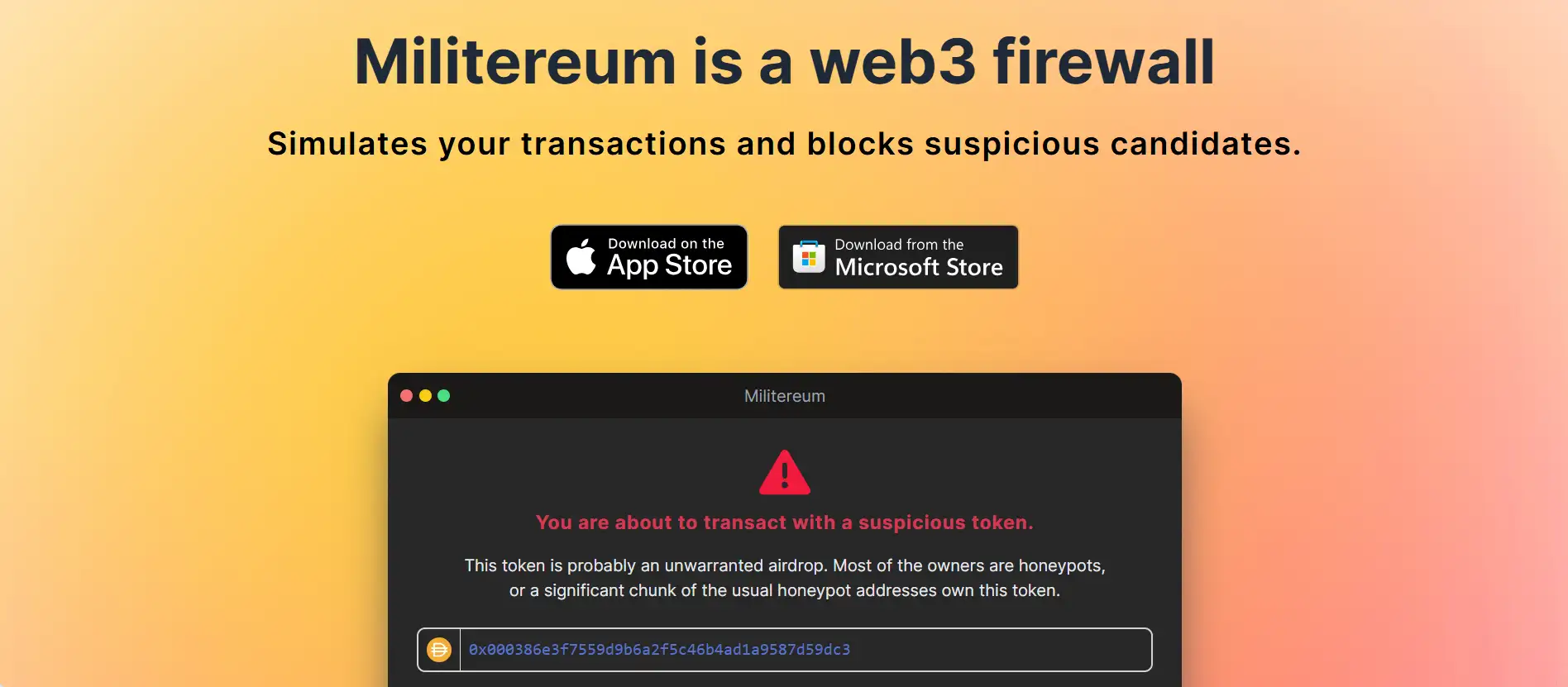 Unlike conventional security solutions, Militereum offers a decentralized-first, non-custodial approach that works seamlessly with any EVM-compatible wallet. Whether you're using MetaMask, Trust Wallet, Frame, or Coinbase Wallet, Militereum ensures your assets remain protected without ever accessing your private keys. It's available as a downloadable app on both Apple and Microsoft platforms, making it a flexible and essential tool for the modern Web3 user.