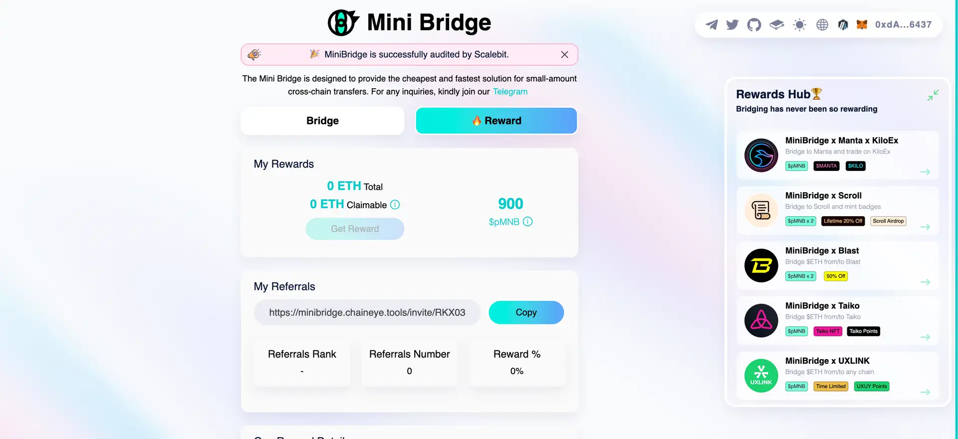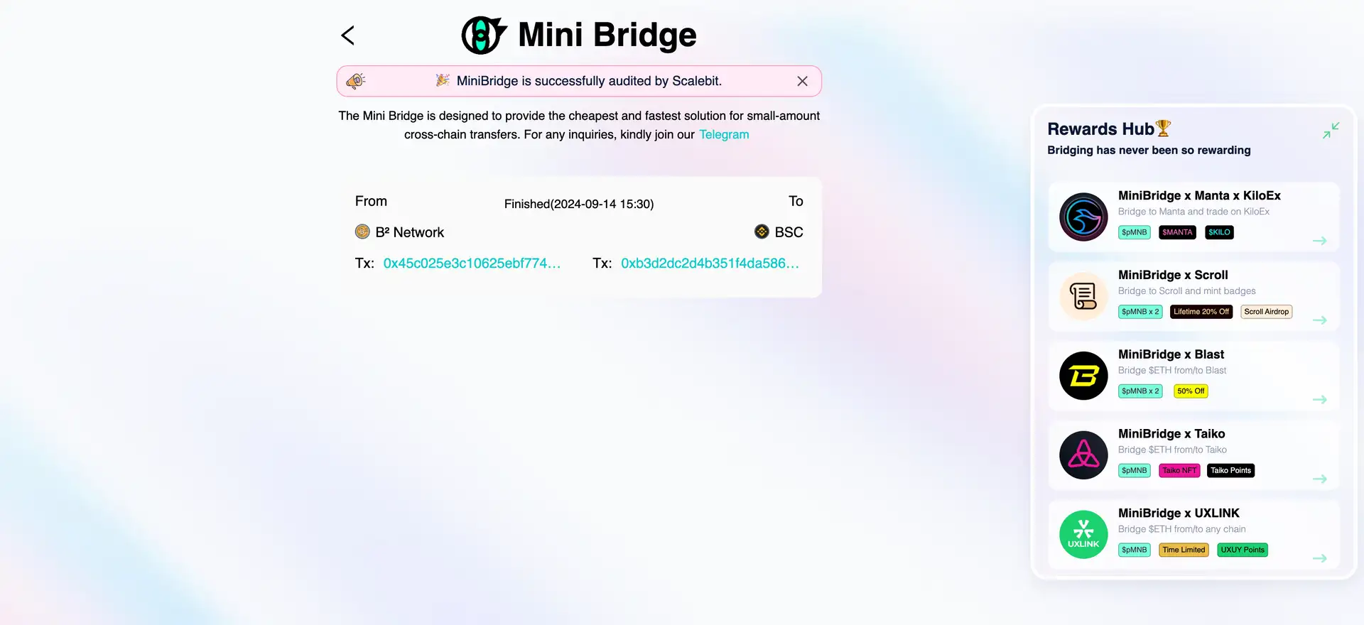 Yes — MiniBridge doesn’t use smart contracts, so there’s no risk of contract hacks. It’s fully non-custodial and audited by Scalebit. Plus, there’s no login or connection required, making it safer from phishing and frontend attacks.