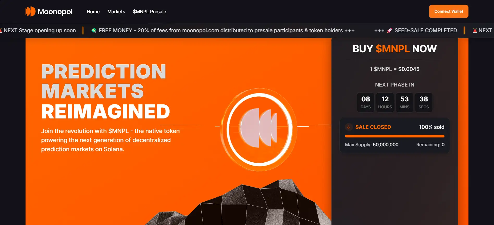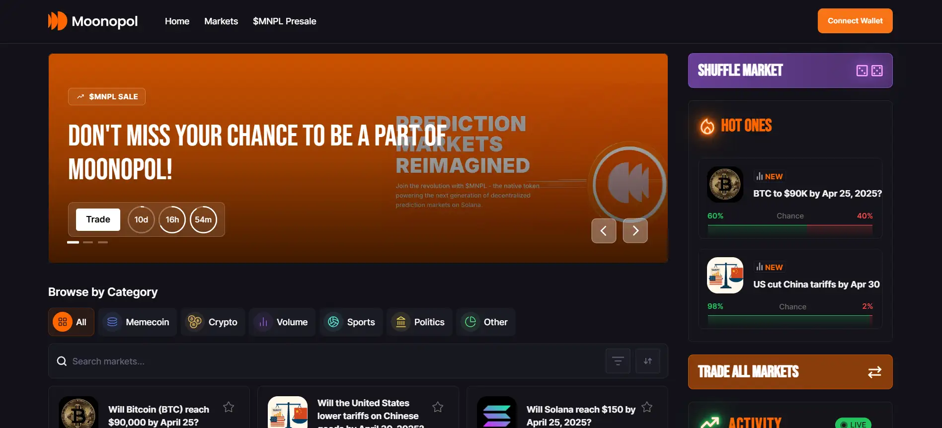 Moonopol is a fully decentralized prediction market platform operating on the high-speed Solana blockchain. It enables users to place bets on real-world events, crypto price movements, sports outcomes, political developments, and more — all in a permissionless and transparent way. Unlike traditional betting platforms or centralized prediction tools, Moonopol is non-custodial, requires no sign-up or KYC, and puts users in direct control of their funds through wallet-based smart contract interactions.